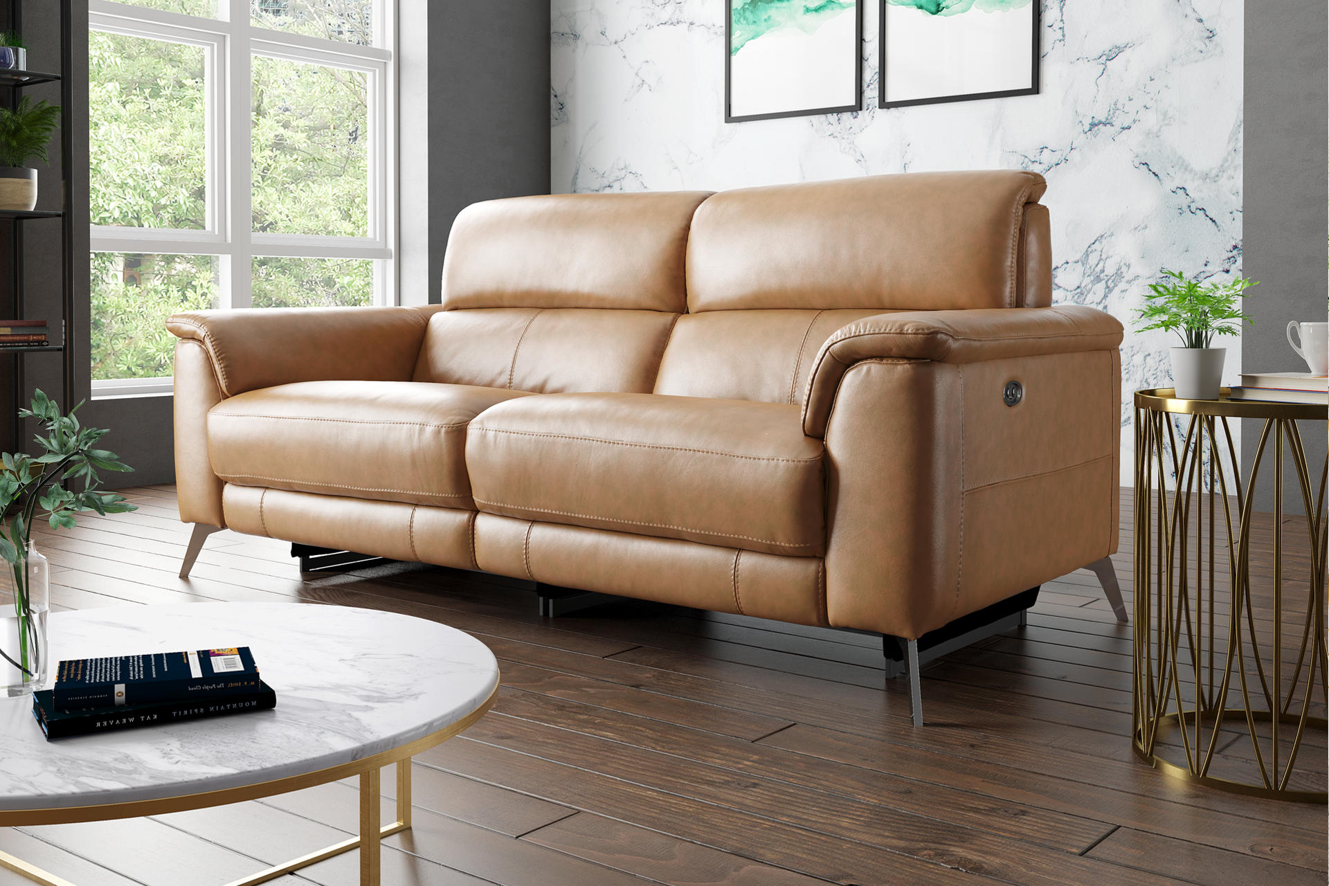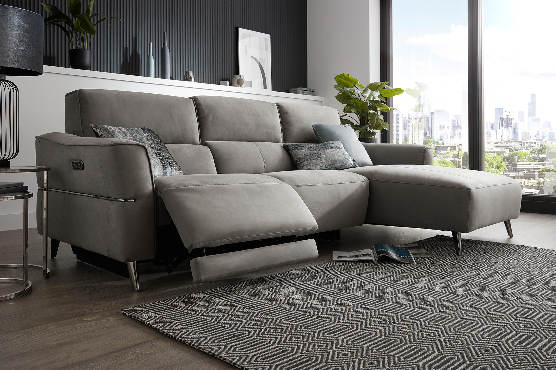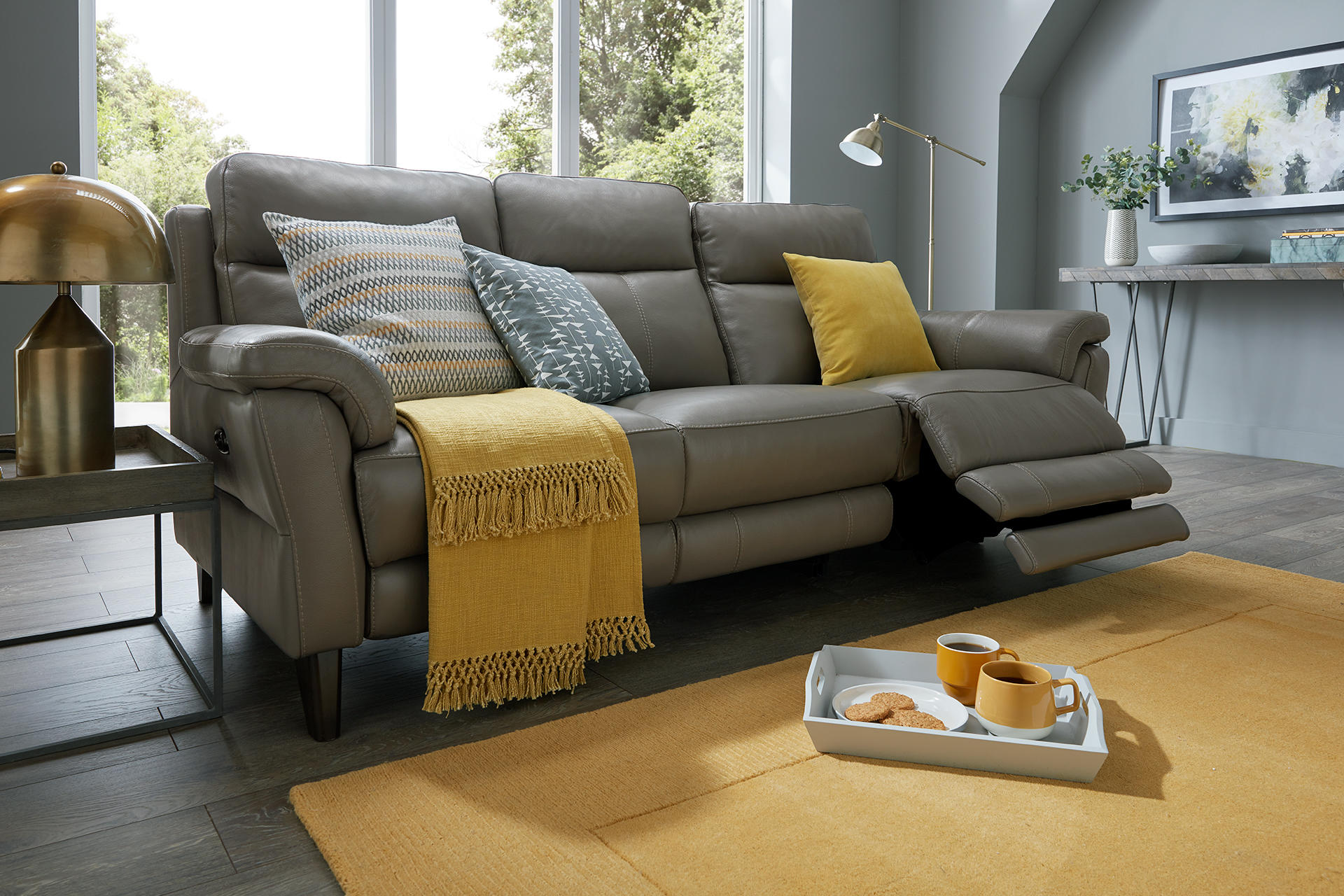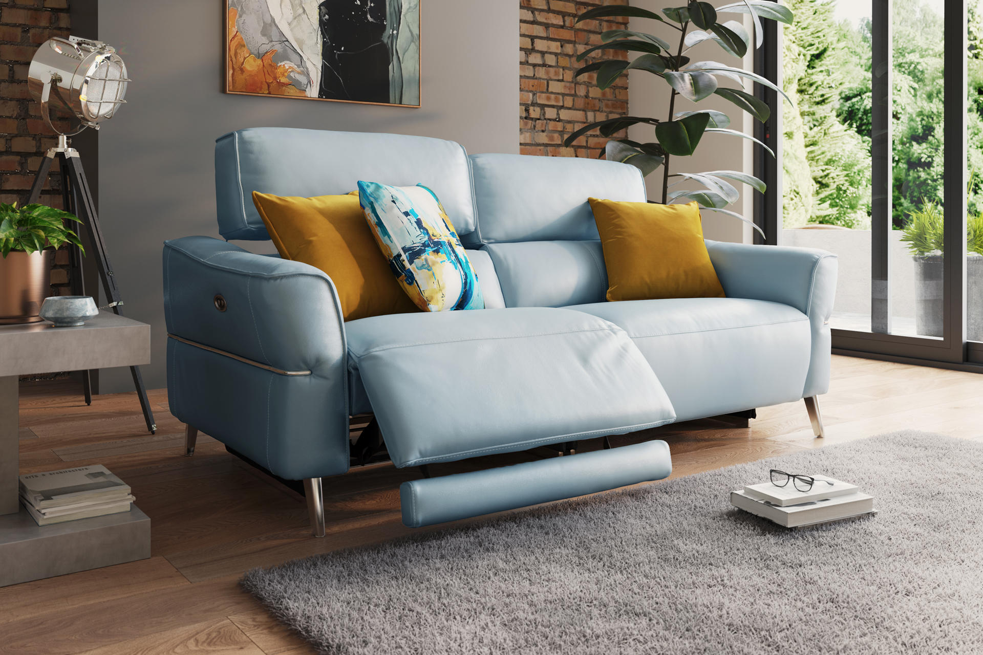 Super contemporary our Dakota sofa is designed to offer amazing style and sumptuous comfort with power recliner options available in the range. Expertly handcrafted from a choice of warm supple leather durable woven mix or luxurious hardwearing Luxe Plus fabric this range offers something for everyone - available in a range of shades from mahogany to silver.Enjoy amazing relaxation on seats featuring a sprung core topped with foam and wrapped in super soft Dacron fibre offer the perfect balance of comfort and support.. The back cushions are filled with foam topped with thick fibre and a Dacron wrap for an extra luxurious feel. Serpentine springs aligned with silent wire support the seat cushions and distribute weight evenly across the sofa for an amazing sit.Designed with a sleek modern silhouette the Dakota features sloping angled arms finished with an eye-catching metallic trim available in a black metal or chrome finish. The arms and back cushions are accented with discreet piping detail around the edges and high-set metal feet complete the look while also supporting the base and frame of the sofa.Available as a static or power recliner sofa opt for the power recliner and relax at an angle that suits you from upright to almost horizontal. The power headrests let you adjust your viewing angle to ensure amazing comfort as you relax in front of the TV and the USB ports allow you to charge your devices as you unwind.Create your own relaxation haven with a choice of sofa sizes corner configurations chaise chairs and footstools available in the range. The Dakota is exclusively designed expertly handcrafted and guaranteed for 20 years.Sofology - Feel at home on a sofa you love.