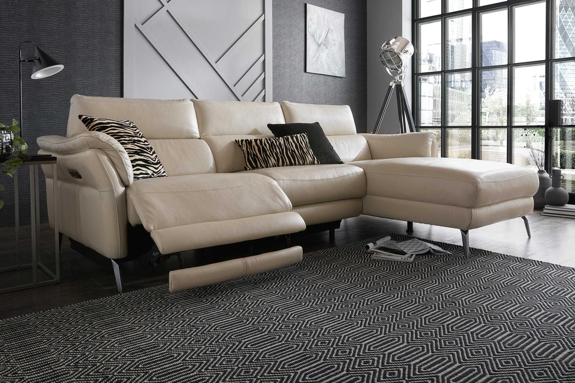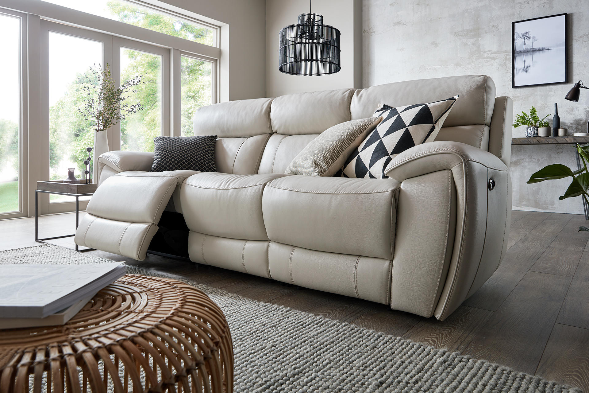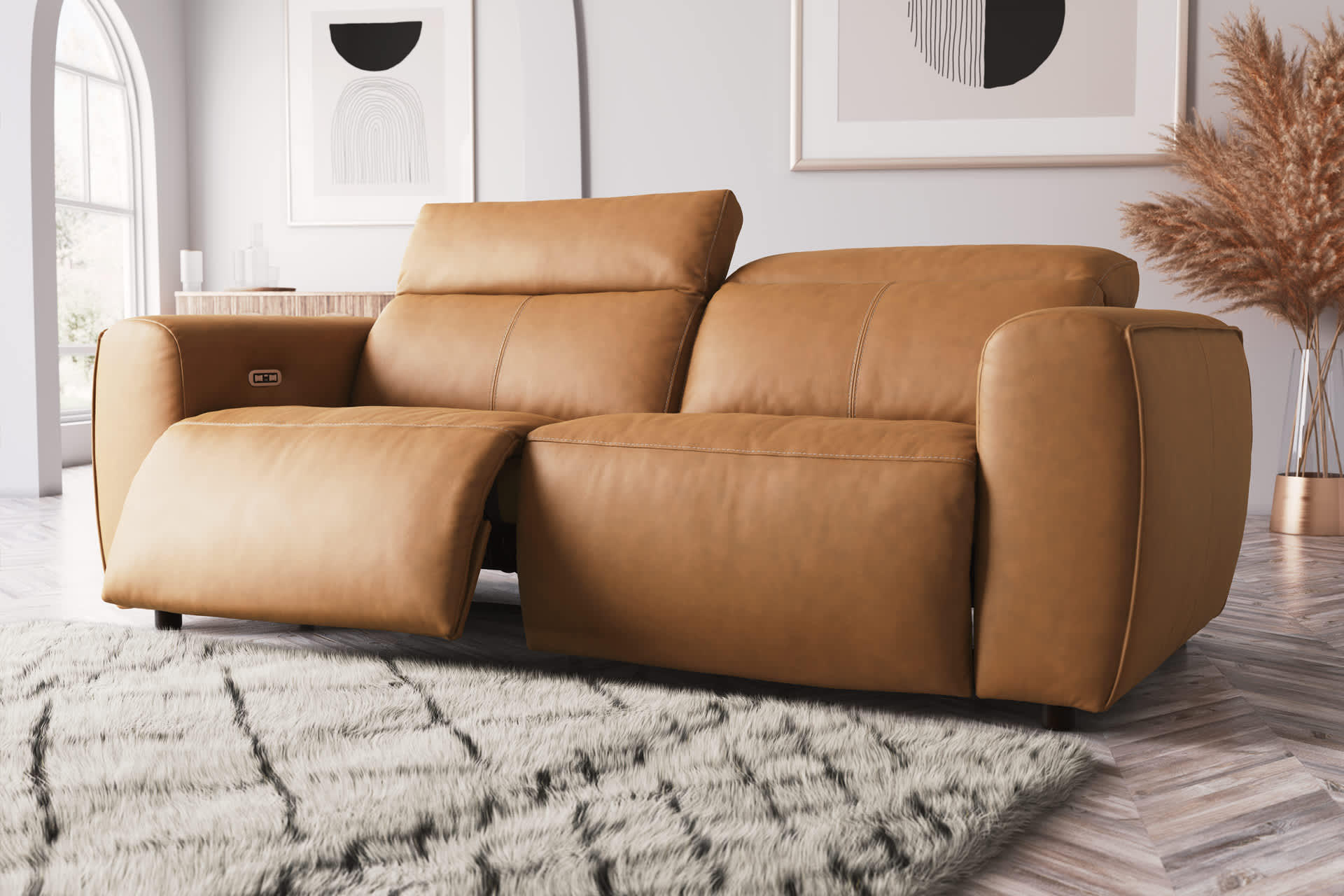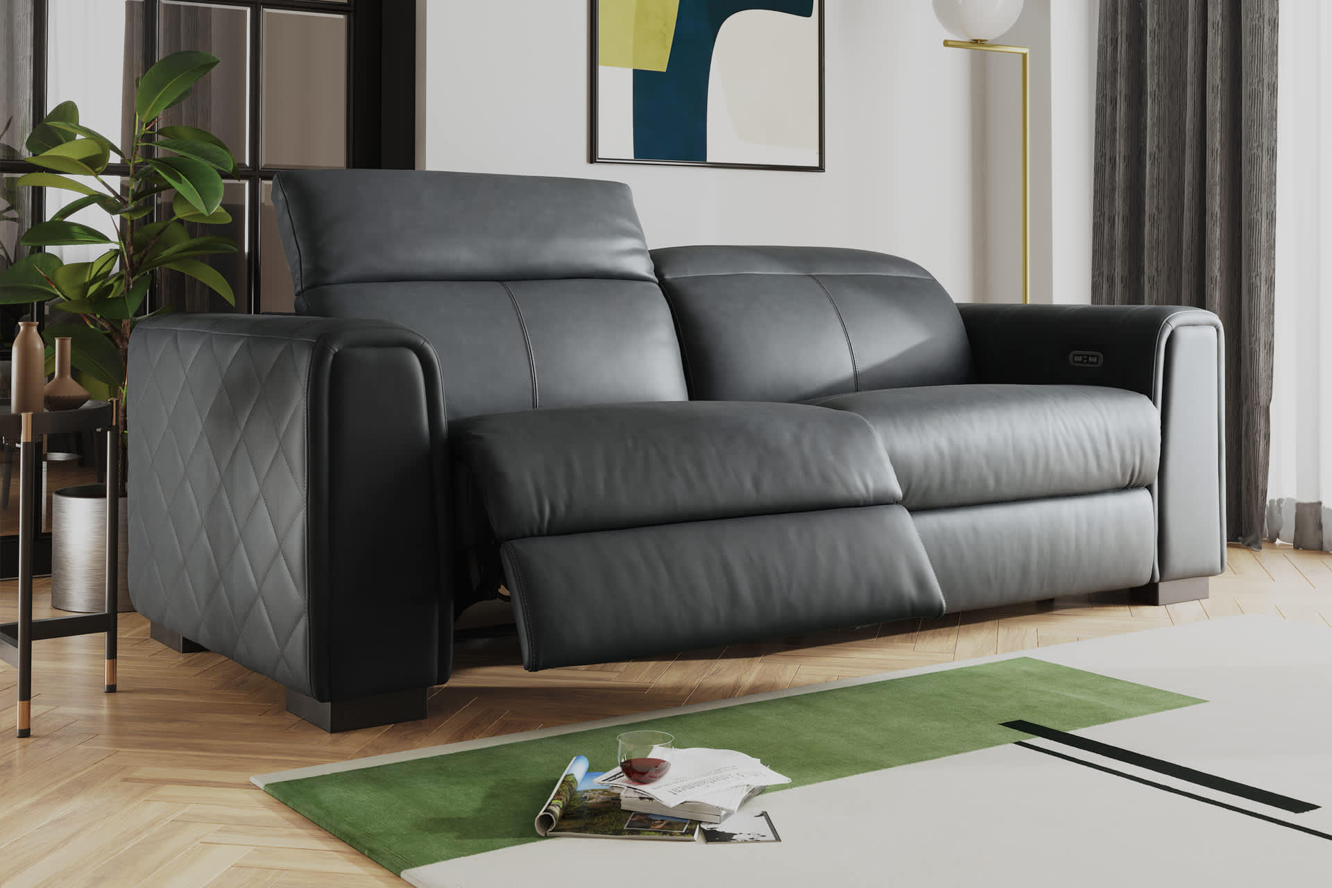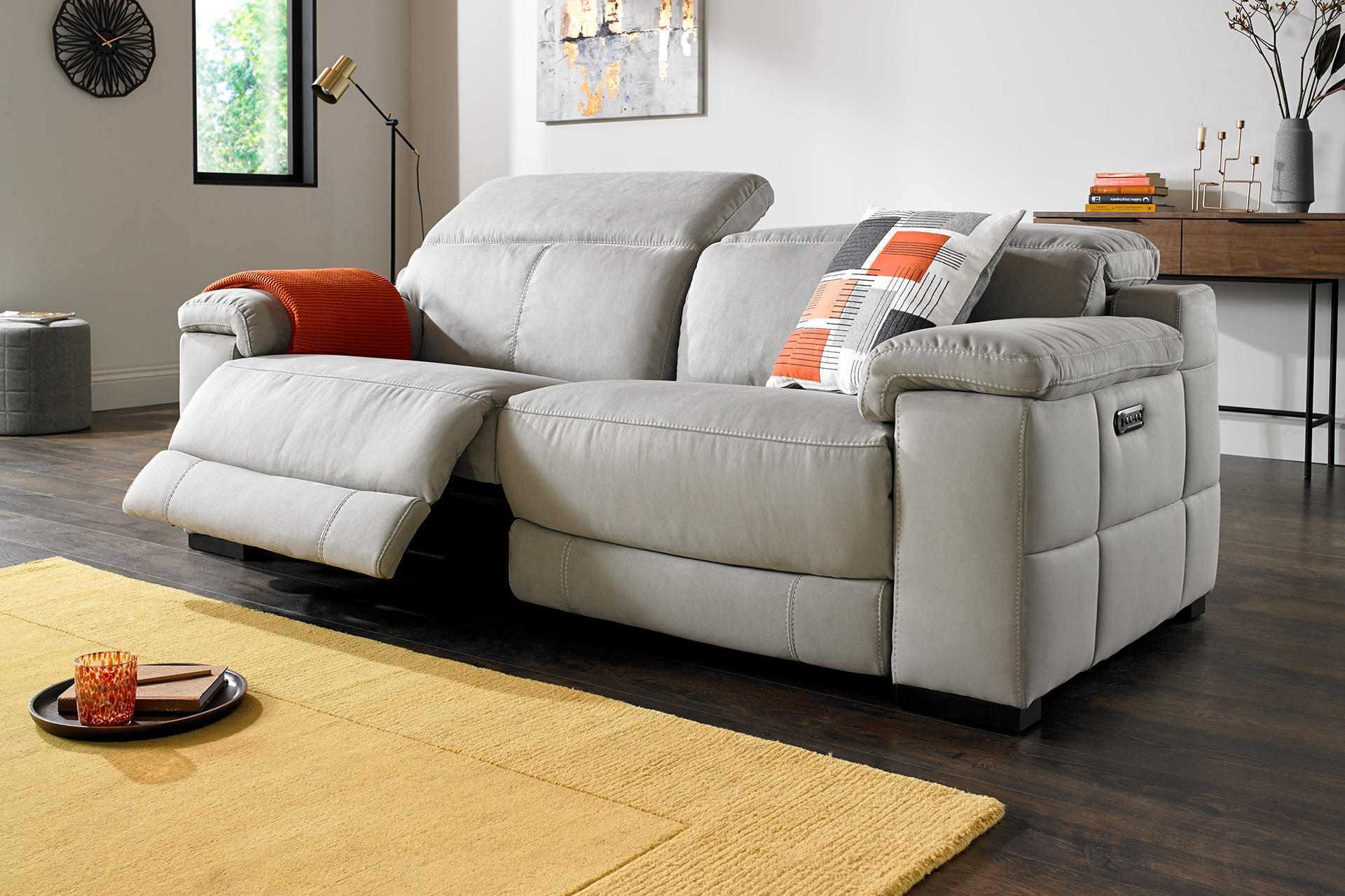 Super contemporary our Dakota sofa is designed to offer amazing style and sumptuous comfort with power recliner options available in the range. Expertly handcrafted from a choice of warm supple leather durable woven mix or luxurious hardwearing Luxe Plus fabric this range offers something for everyone - available in a range of shades from mahogany to silver.Enjoy amazing relaxation on seats featuring a sprung core topped with foam and wrapped in super soft Dacron fibre offer the perfect balance of comfort and support.. The back cushions are filled with foam topped with thick fibre and a Dacron wrap for an extra luxurious feel. Serpentine springs aligned with silent wire support the seat cushions and distribute weight evenly across the sofa for an amazing sit.Designed with a sleek modern silhouette the Dakota features sloping angled arms finished with an eye-catching metallic trim available in a black metal or chrome finish. The arms and back cushions are accented with discreet piping detail around the edges and high-set metal feet complete the look while also supporting the base and frame of the sofa.Available as a static or power recliner sofa opt for the power recliner and relax at an angle that suits you from upright to almost horizontal. The power headrests let you adjust your viewing angle to ensure amazing comfort as you relax in front of the TV and the USB ports allow you to charge your devices as you unwind.Create your own relaxation haven with a choice of sofa sizes corner configurations chaise chairs and footstools available in the range. The Dakota is exclusively designed expertly handcrafted and guaranteed for 20 years.Sofology - Feel at home on a sofa you love.