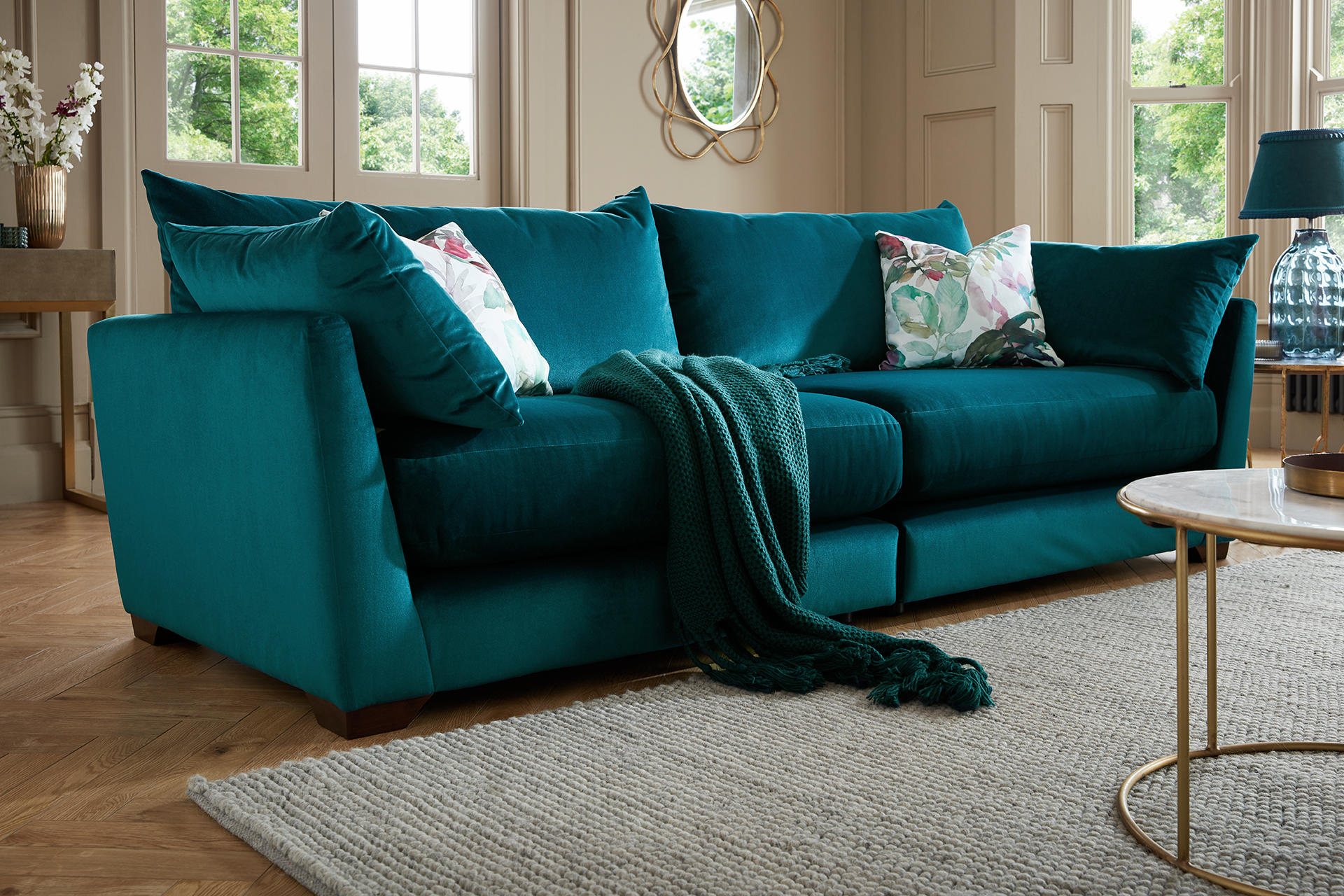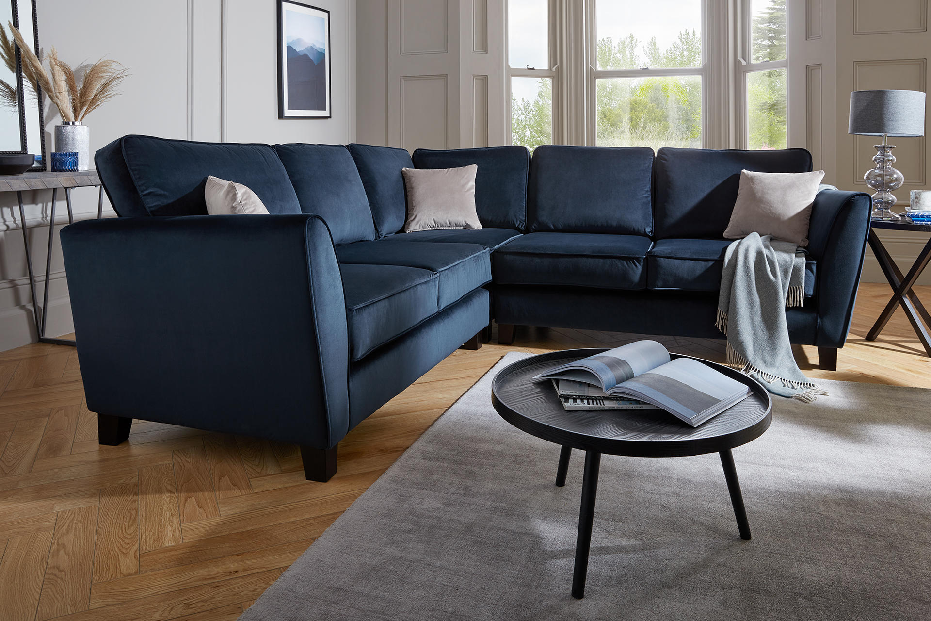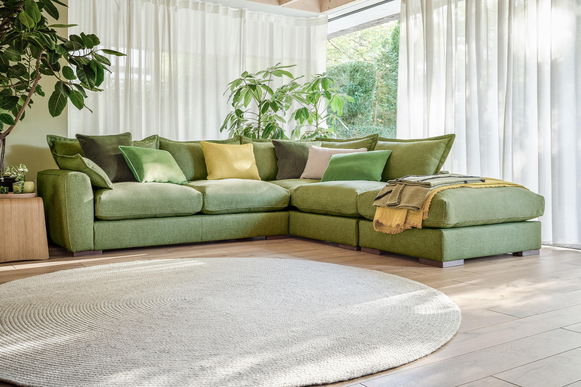 Grand in scale our Infinity sofa combines contemporary cosy design with the latest in sustainable innovations to create a sofa that’s kinder to our planet without compromising on comfort or style. Offering luxurious sink-in comfort this range is handcrafted from a choice of premium velvet durable warm tweed or a combination of both and the fabric options on the Infinity are made from recycled pre-consumer textile waste.Choose seat cushions filled with Ultraflex Encore for a more supportive sit - they’re sustainable made from 20% recycled polyester with plastic bottle content. These seats need little maintenance to stay looking great. Alternatively opt for softer seat cushions filled with recyclable Quallofil® Blue fibre which uses 50% recycled plastic from the Plastic Bank one of the leading global solutions to stopping ocean plastic. Both of these seat options are recyclable at the end of their lifespan. Serpentine springs aligned with silent wire support the seat cushions and distribute weight evenly across the sofa.The super soft back cushions are filled with recycled waste polyester and mould to your shape as you unwind. Helping to support a circular economy the padding in the body of the sofa is made from compressed and laminated polyester fibre which is just as supportive as foam but can be repeatedly recycled.Designed with a bold square silhouette the Infinity offers simple minimalist style and a deep cosy cushions you’ll love to relax on. Discreet wooden feet and intricate piping detail on the cushions completes the cosy contemporary look. Feather filled scatter cushions are included in the range adding an extra layer of cosy comfort as you unwind.The Infinity is available in a range of sofa sizes corner configurations loveseat and accent chair as well as an infinite range of modular options. Choose from a range of shades including slate grey to evergreen and you can choose a different type of fabric and colour on each modular piece giving you greater customization options.With the modular options available this range offers an infinite amount of configurations so you can create a shape and size that’s the right fit for your home. Once the sofa reaches the end of its life virtually all elements of the sofa can be diverted from landfill and repurposed and recycled where possible. This gives the Infinity a sustainable life cycle. The Infinity is exclusively designed expertly handcrafted and guaranteed for 20 years.