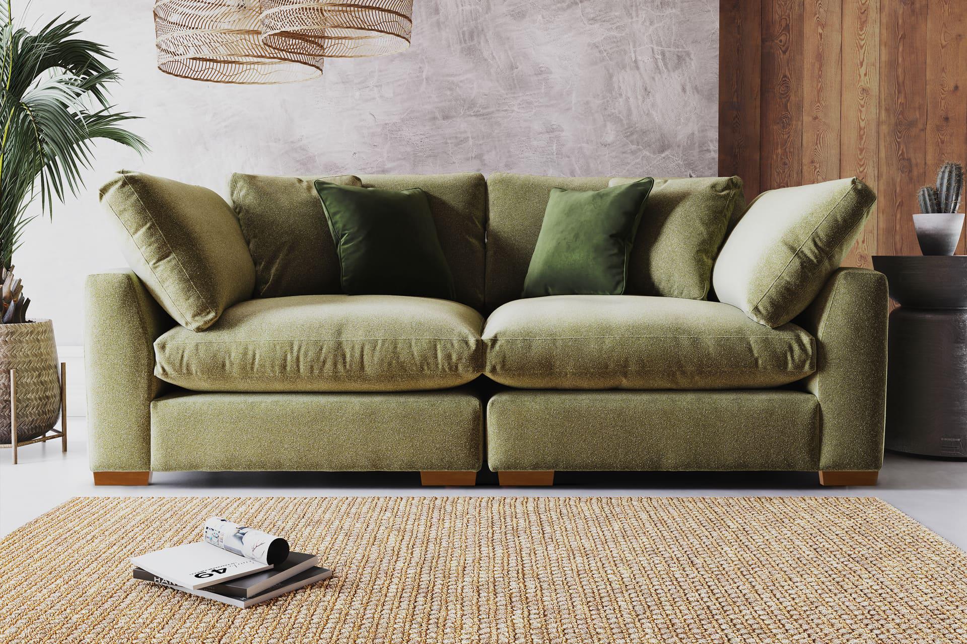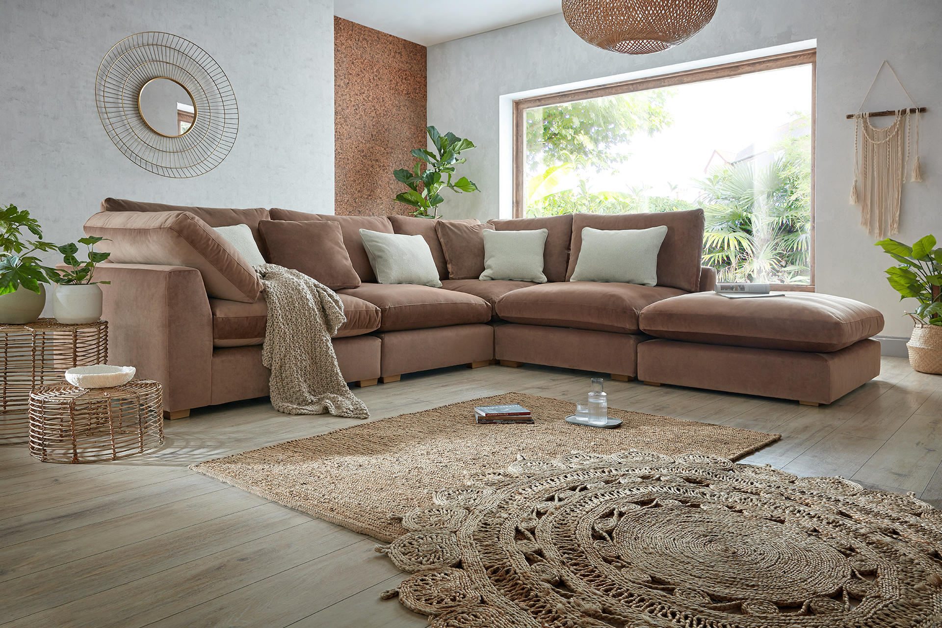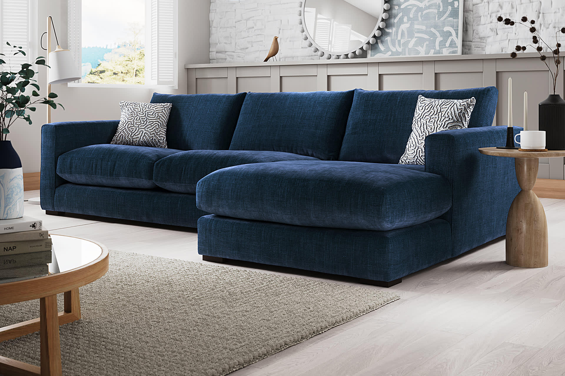 Grand in scale our Infinity sofa combines contemporary cosy design with the latest in sustainable innovations to create a sofa that’s kinder to our planet without compromising on comfort or style. Offering luxurious sink-in comfort this range is handcrafted from a choice of premium velvet durable warm tweed or a combination of both and the fabric options on the Infinity are made from recycled pre-consumer textile waste.Choose seat cushions filled with Ultraflex Encore for a more supportive sit - they’re sustainable made from 20% recycled polyester with plastic bottle content. These seats need little maintenance to stay looking great. Alternatively opt for softer seat cushions filled with recyclable Quallofil® Blue fibre which uses 50% recycled plastic from the Plastic Bank one of the leading global solutions to stopping ocean plastic. Both of these seat options are recyclable at the end of their lifespan. Serpentine springs aligned with silent wire support the seat cushions and distribute weight evenly across the sofa.The super soft back cushions are filled with recycled waste polyester and mould to your shape as you unwind. Helping to support a circular economy the padding in the body of the sofa is made from compressed and laminated polyester fibre which is just as supportive as foam but can be repeatedly recycled.Designed with a bold square silhouette the Infinity offers simple minimalist style and a deep cosy cushions you’ll love to relax on. Discreet wooden feet and intricate piping detail on the cushions completes the cosy contemporary look. Feather filled scatter cushions are included in the range adding an extra layer of cosy comfort as you unwind.The Infinity is available in a range of sofa sizes corner configurations loveseat and accent chair as well as an infinite range of modular options. Choose from a range of shades including slate grey to evergreen and you can choose a different type of fabric and colour on each modular piece giving you greater customization options.With the modular options available this range offers an infinite amount of configurations so you can create a shape and size that’s the right fit for your home. Once the sofa reaches the end of its life virtually all elements of the sofa can be diverted from landfill and repurposed and recycled where possible. This gives the Infinity a sustainable life cycle. The Infinity is exclusively designed expertly handcrafted and guaranteed for 20 years.
