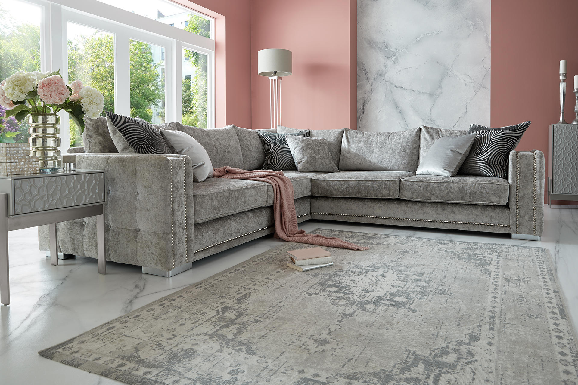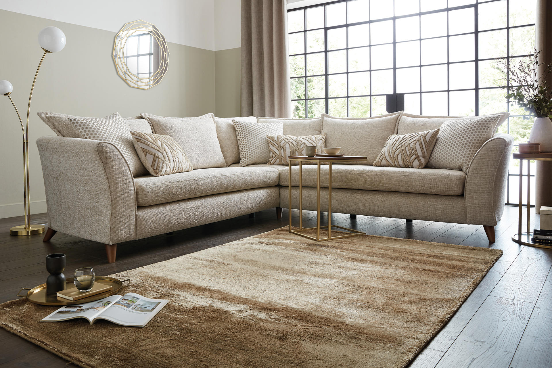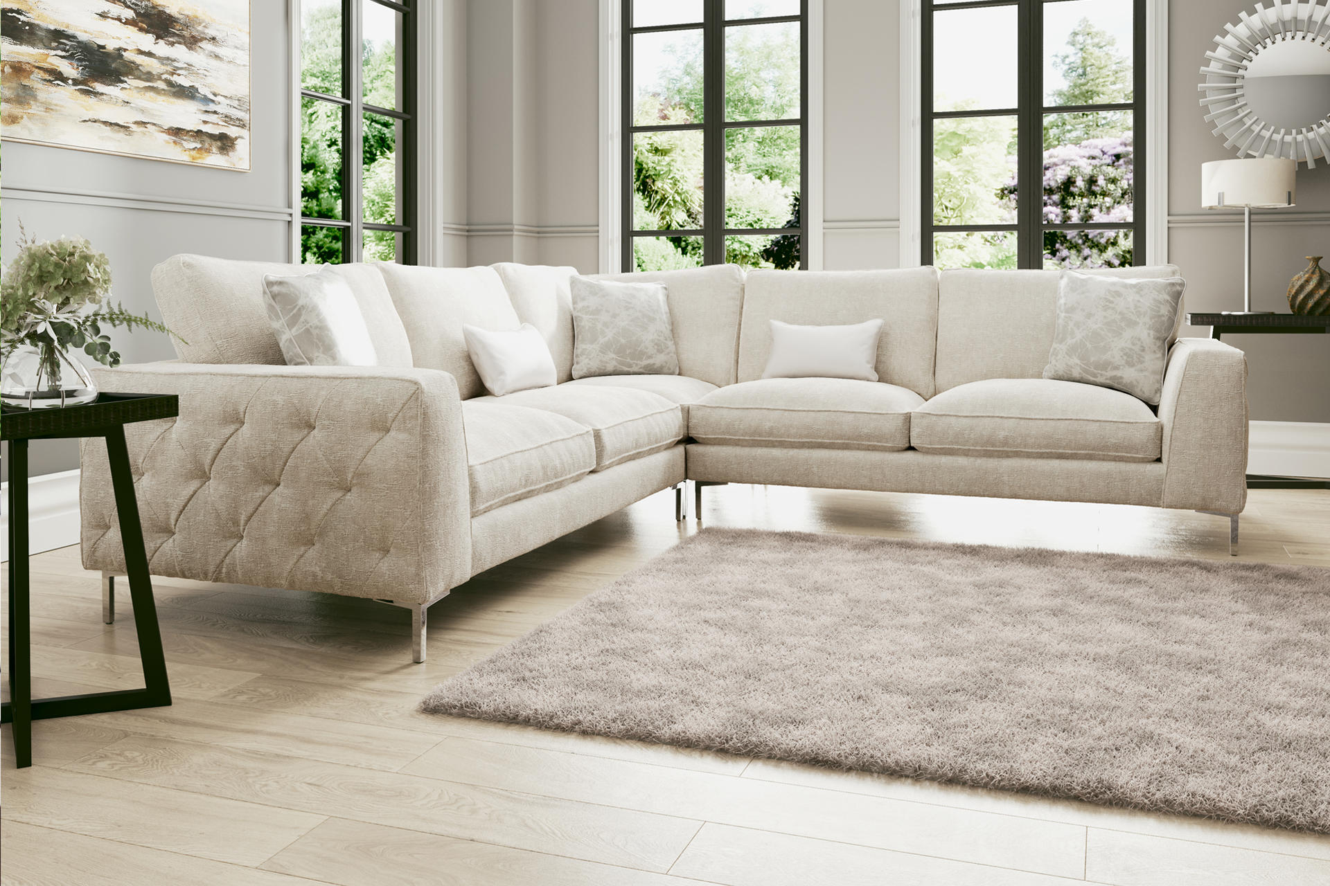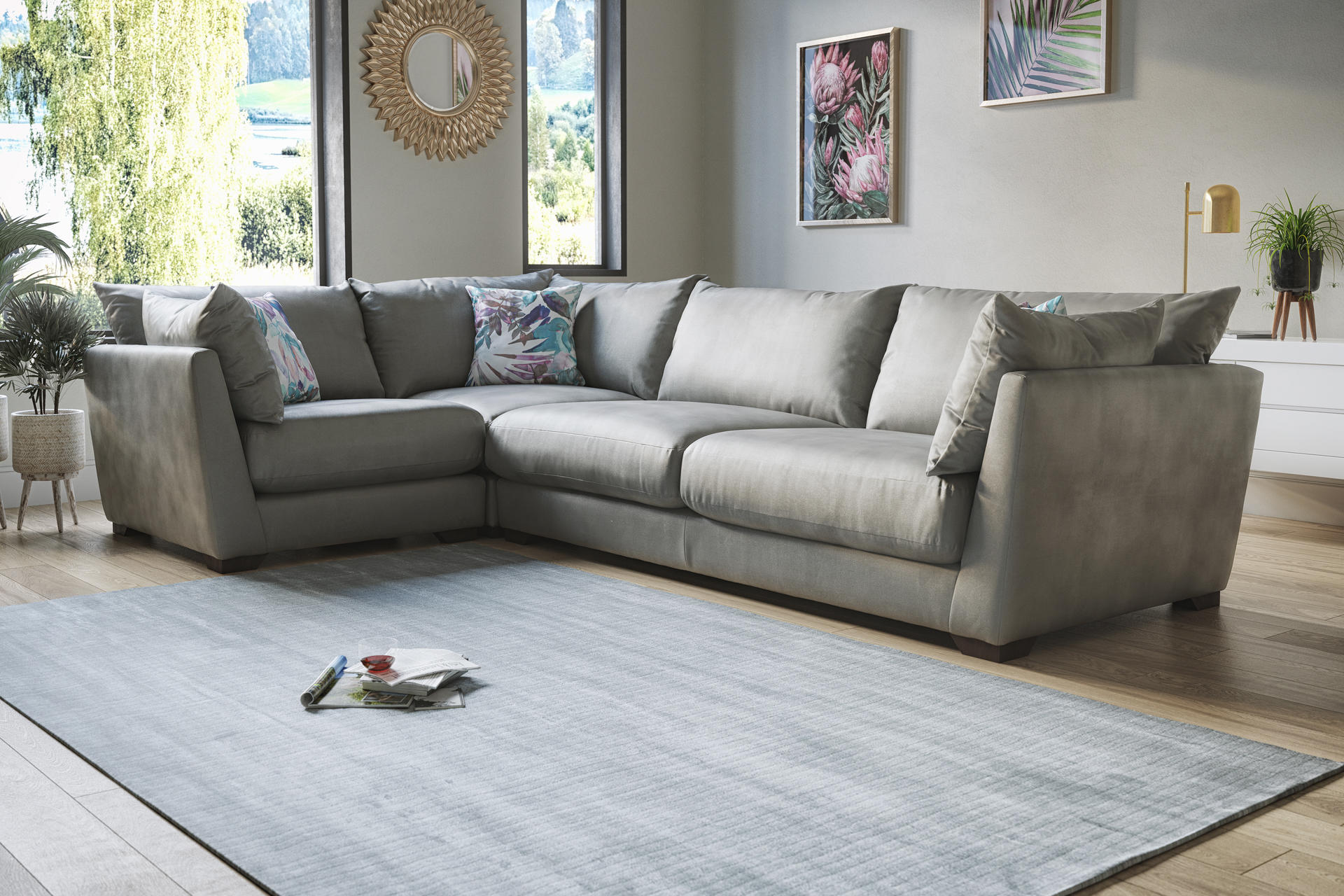 Sleek and comfy, the Piazza range is a perfect choice for those who love the finer things in life. Crafted from a soft, tactile chenille fabric in a choice of gorgeous shades, from moss green to silver, this sofa invites you to settle down and relax. Effortlessly minimal, the Piazza is ready and waiting to help you unwind after a busy day. Designed with a modern silhouette, the Piazza is a contemporary take on a classic sofa shape. Available as a curved corner sofa, this range has subtle yet intricate inlaid arm detailing, piped edges and scatter back cushions finished with an oxford border. Sitting on discreet wooden feet, available in a choice of walnut or grey ash shades, the Piazza sits low to the floor for a cosy, contemporary feel. Curl up and enjoy the perfect balance of comfort and support on seats filled with foam wrapped in soft Dacron fibre. Available with cosy, fibre filled full back or luxurious, feather filled pillow back cushions, you can choose your ideal comfort on the Piazza. Solid steel serpentine springs, aligned with silent wire, sit under the seat cushions, adding extra support and making it easier to care for your sofa. Create your own relaxation haven, with a choice of sofa sizes, corner configurations, chair and footstools in the range. Scatter cushions are included in the range, with a choice of patterned or plain all-over fabrics available, depending on your sofa shade. The Piazza is exclusively designed, expertly handcrafted and comes with a 20 year structural guarantee included. Sofology - Feel at home on a sofa you love