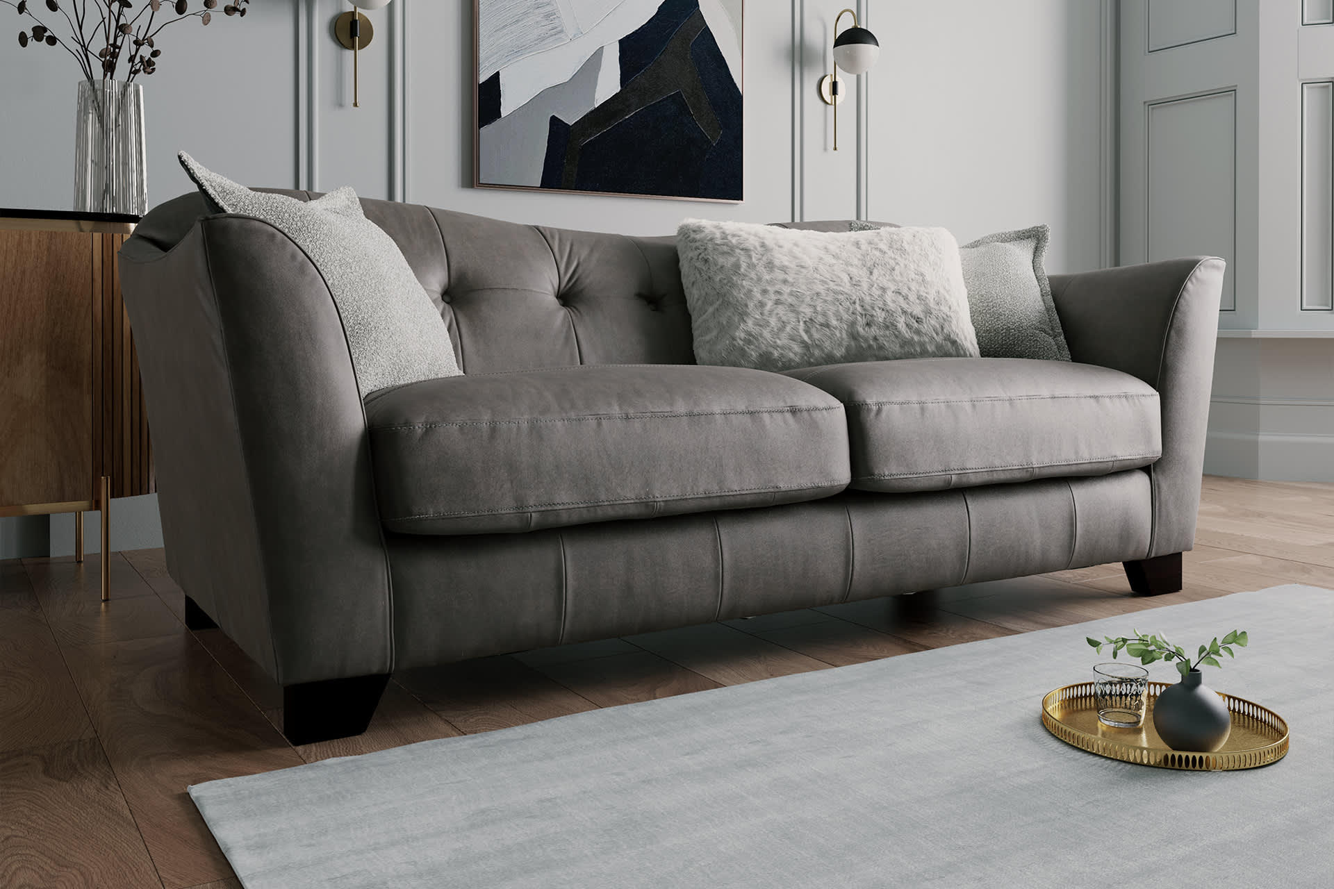 With an on-trend, curved profile, the Bartello is a show-stopping sofa that will be the centrepiece of your space. It's expertly handcrafted in the UK and made for blissful comfort you want to leave. Crafted from a choice of supple character leather or warm chenille, this range is ideal for those who love extra long snoozes on a sofa they love. The fully sprung back is filled with resilient foam and finished with deep buttoned detailing, for an elegant look that feels amazing to relax against. Solid wood feet in a choice of walnut, black or grey ash shades complement the soft curves and bold angled lines on the Bartello, helping to support the sofa. Deep, inviting seats filled with a resilient foam topped with a layer of soft foam offer the ideal balance of comfort and support - plump regularly to keep them looking great. Solid steel serpentine springs, aligned with silent wire, sit under the seat cushions to help with maintenance, ensuring you don’t sink into the corners of the sofa.From almond brown to silver grey, the Bartello is available in a choice of muted, neutral shades to perfectly complement any living room. Coordinating feather-filled scatter cushions are also included for added comfort.Opt for the character leather and enjoy a finish that’s unique to you. Character leather is left almost completely untreated to allow the natural characteristics of the hide to shine, and will age beautifully over time. This type of leather is suited for families who can take a little extra care to keep it looking great.Choose from a range of sofa sizes, sofa beds, chairs and footstools in the range, to turn your space into a cosy haven you can’t wait to come home to. The Bartello is exclusively designed, expertly handcrafted and comes with a 20 year structural guarantee included.Sofology - Feel at home on a sofa you love.