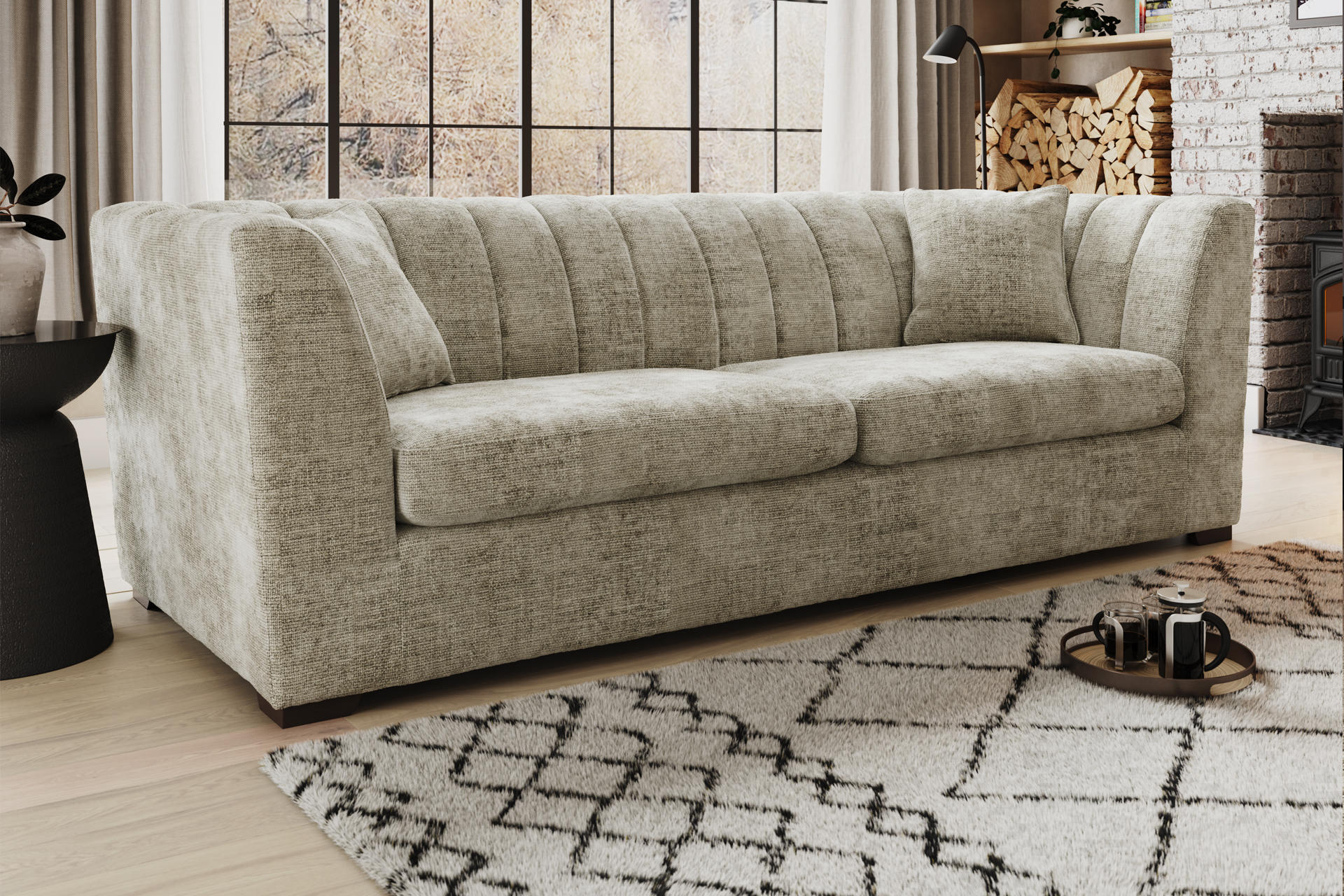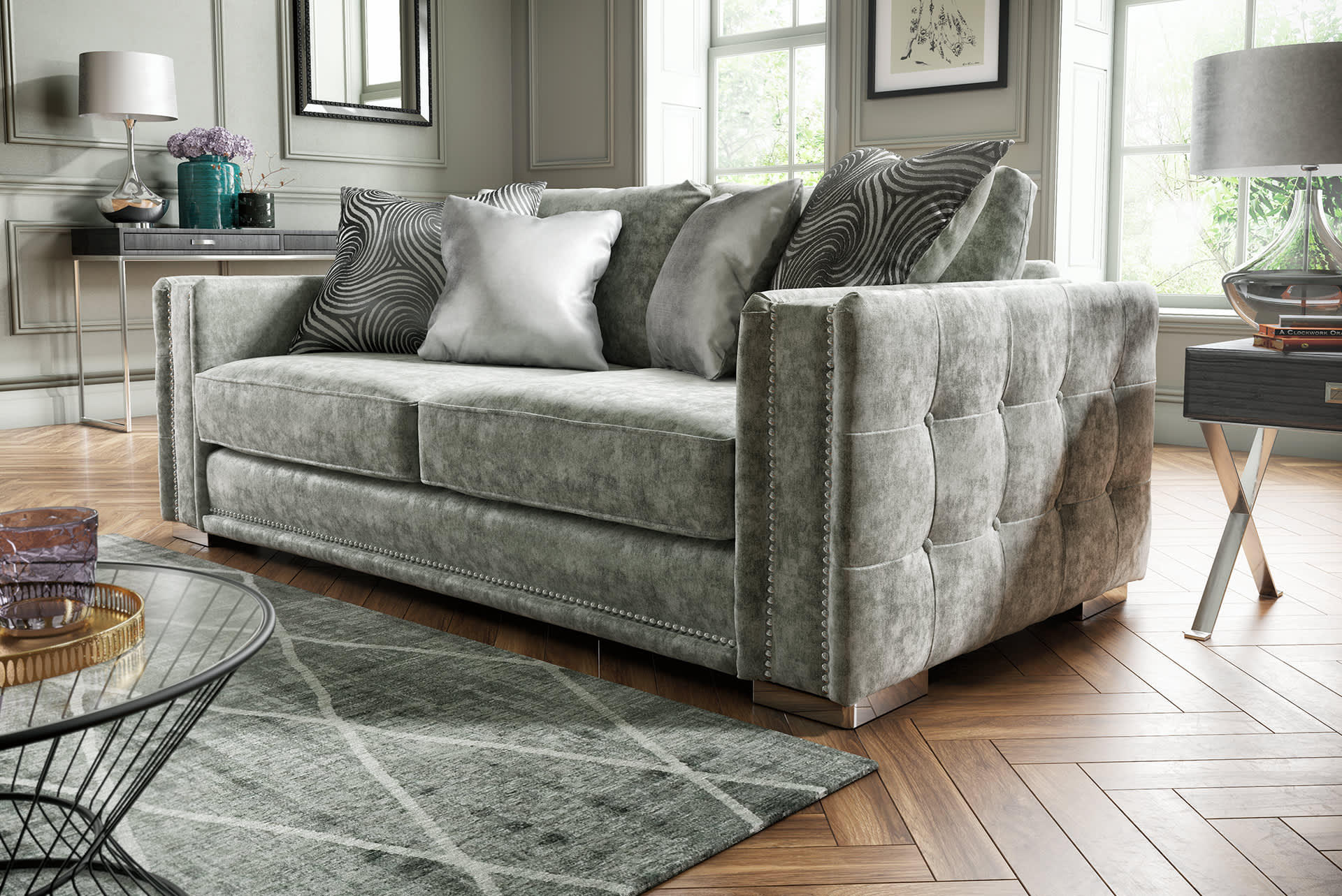 Expertly handcrafted intricately designed and exclusive to Sofology the Midas is a glamorous centrepiece sofa that offers super cosy comfort. Available in luxuriously warm soft chenille it’s the perfect sofa to create your own relaxation haven at home.Seat cushions filled with foam and a super soft Dacron fibre wrap provide incredible comfort and support - simply remember to plump them regularly to keep your sofa looking its best. The seats are supported by solid steel serpentine springs aligned with silent wire to ensure you don’t find yourself slipping into the corners when you settle down for an evening in front of the TV.The back cushions on the Midas are filled with pillow soft fibre which hugs your figure and envelops you in sumptuous comfort that you won’t want to leave. Textured scatter cushions filled with super soft feathers are included with the sofa to add an extra layer of comfort and style.Amazing craftsmanship and attention to detail can be seen across the entirety of the Midas from the button finished sides to the optional hand nailed chrome studs across the arms and front of the sofa. The contemporary low back design and bold squared arms enhance the sleekness and glamour of the style so this sofa will stand out as a feature of any room. The Midas is finished with mirror effect chrome feet that offer eye-catching style as well as adding extra support to the base and the frame of the sofa. Both the seat and back cushions of the Midas are reversible giving your sofa twice the life and making it easier to look after. Available in a choice of shades of sumptuous chenille fabric the Midas can easily fit within any interior design scheme. Create your own cosy hub of style and comfort with a range of sofa sizes sofa beds corner configurations accent chair loveseat and footstools to suit your home family and tastes.The Midas is exclusively designed expertly handcrafted and guaranteed for 20 years.Sofology - Feel at home on a sofa you love.