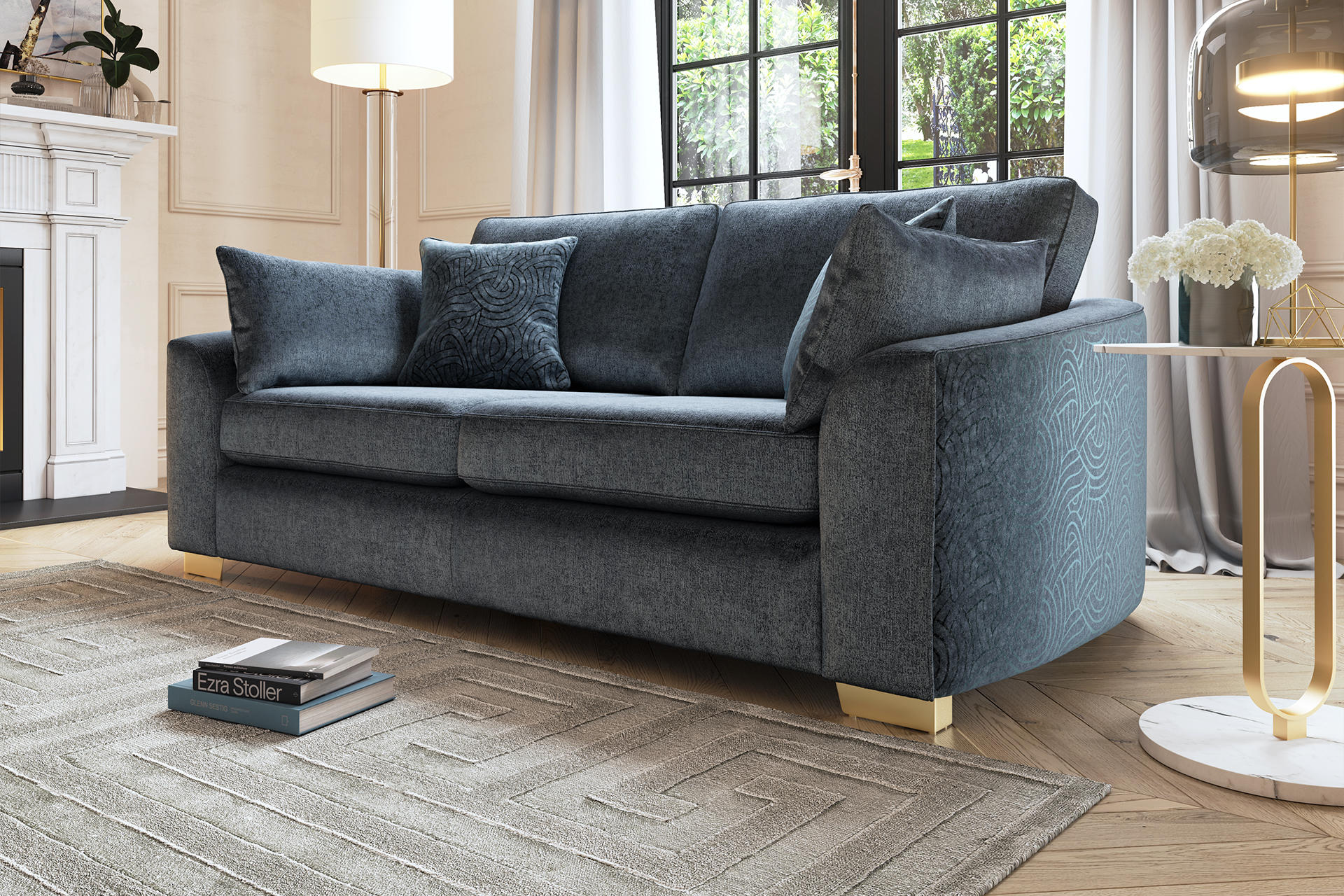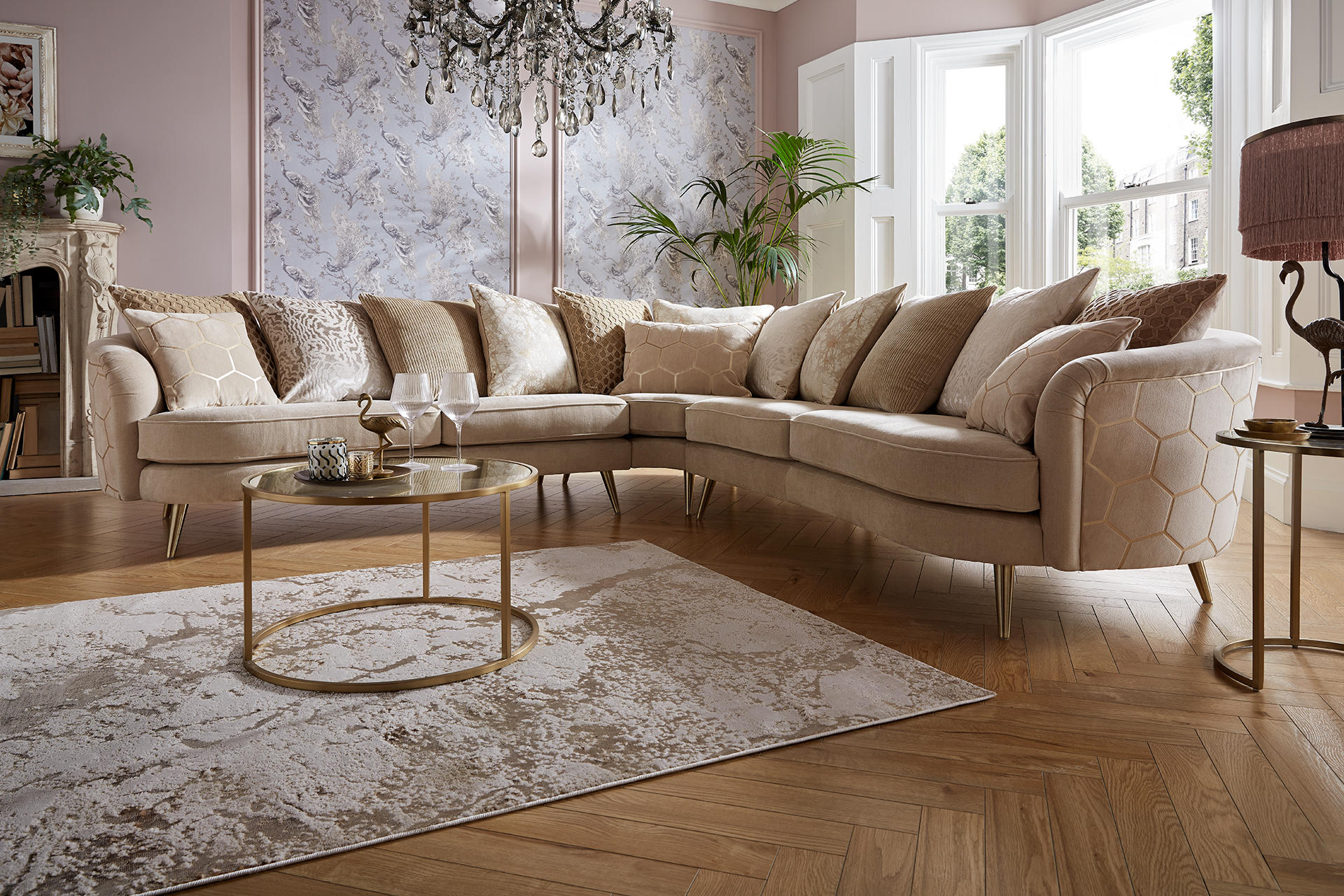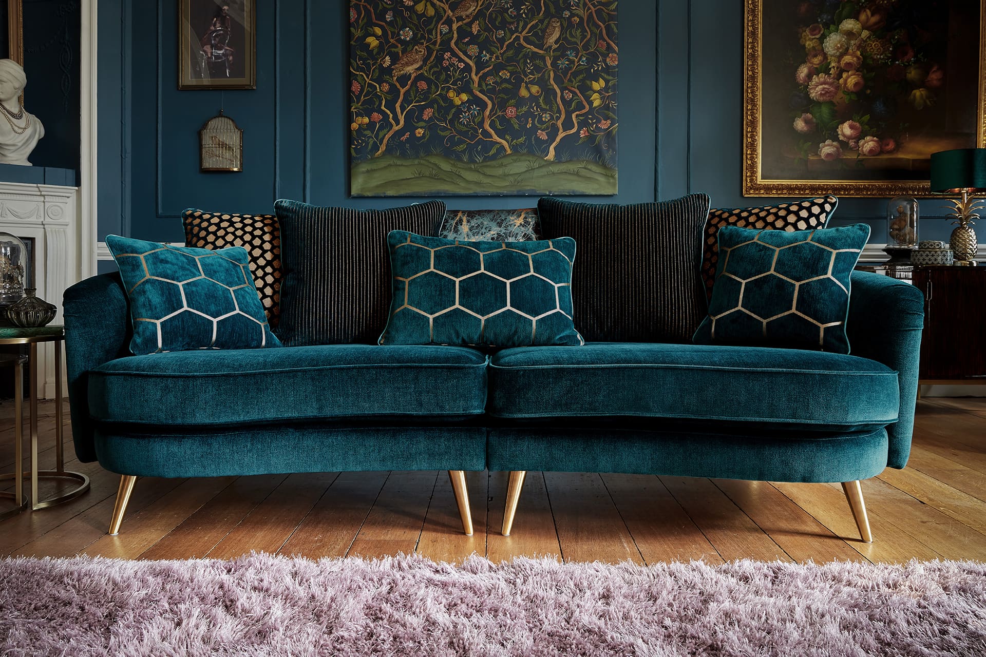 Totally luxurious supremely comfortable and finished with intricate detailing throughout our Honeycomb sofa is a delight to behold. Crafted from stunning chenille fabric with a short cosy pile this range is finished with a beautiful geometric design inspired by this sofa’s namesake that runs from the arms around the back of the sofa.With a sweeping curved silhouette this range is designed to stand out in your space. Standing on sleek high set legs with a gold metallic finish this sofa looks super contemporary the perfect showstopping piece that will work at the centre of your space.The seat cushions are filled with foam wrapped in soft Dacron fibre offering supreme support and comfort you won’t want to leave. The seats are supported by solid steel serpentine springs aligned with silent wire ensuring you don’t sink into the corners of the sofa. A scatter back design the Honeycomb features feather filled back cushions that absorb you as you relax moulding to your shape for the ultimate cosy feel.Choose from a selection of pretty fabric shades from neutral beige to silver and teal. The scatter back cushions are reversible featuring intricate geometric patterns on one side and block colour on the other so you can adjust the look of your sofa to suit you. Create a stylish haven of relaxation with a range of sofa sizes corner configurations chairs and footstools available.The Honeycomb is exclusively designed expertly handcrafted and guaranteed for 20 years.Sofology - Feel at home on a sofa you love.