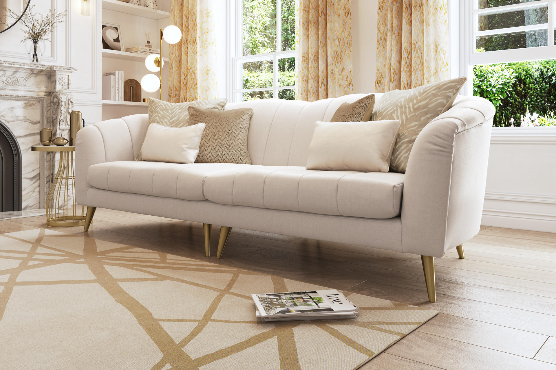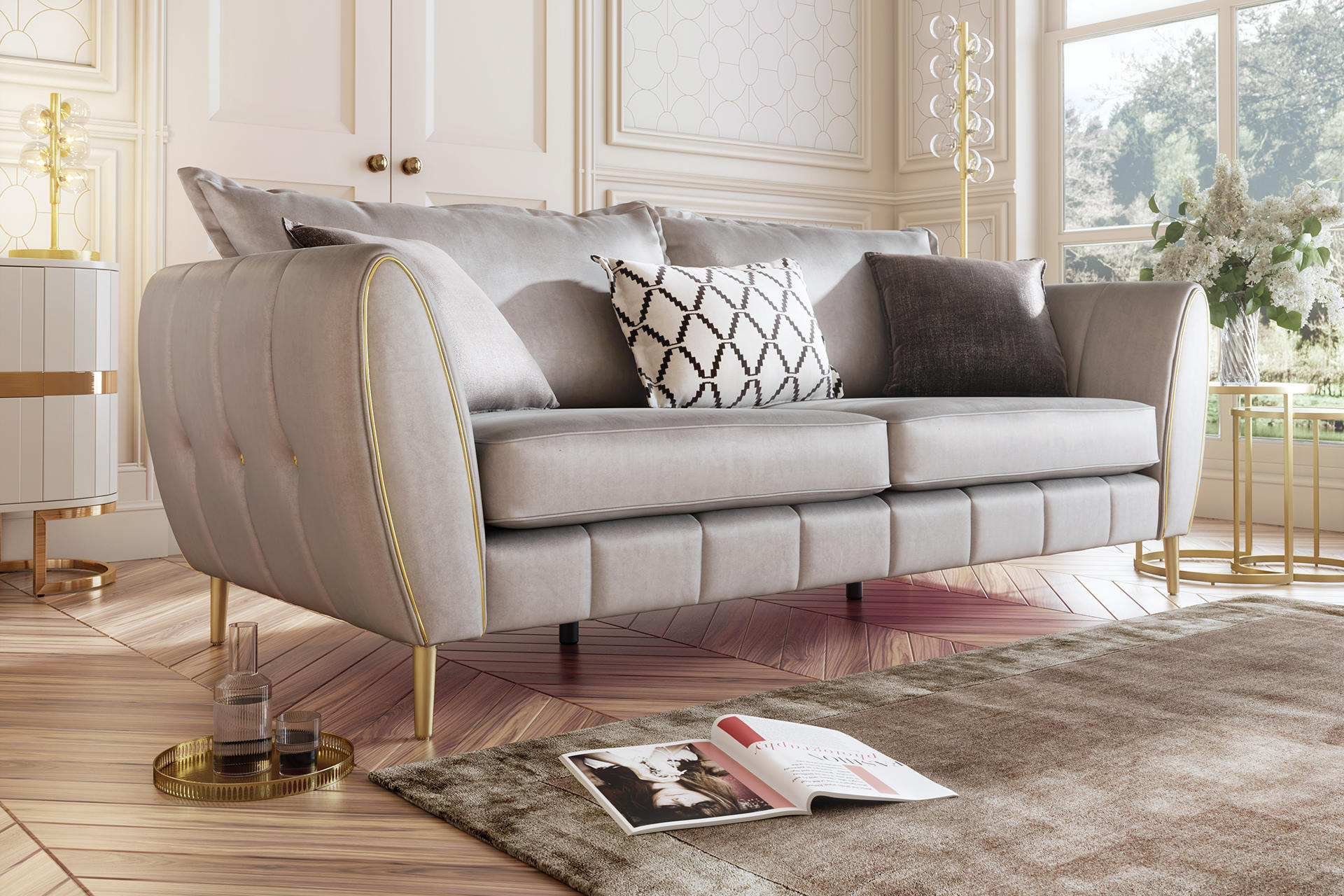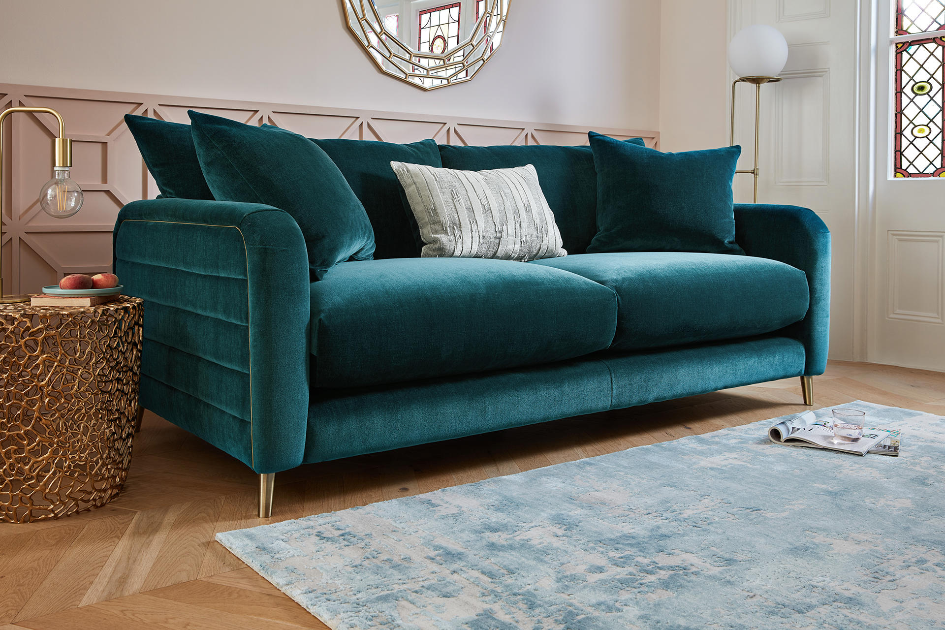 Art deco glamour mid-century modern simplicity and a luxurious boutique feel - the Gabrielle has it all. From the super soft velvet fabric to the stunning metallic trim the Gabrielle is highly detailed and exquisitely finished. Fluted detailing on the base and arms creates a quilted look complemented by the piped edges of the seats and the Oxford style borders of the plump back cushions. Available in a choice of gold or silver the curved arms feature an optional metallic trim that matches the high-set feet along with the optional antique effect buttons found on the side of the sofa. Whether you prefer a subtle shade or jewel tones the Gabrielle is available in a hue you’ll want to build your room around. Textured patterned scatter cushions are included in the range so you can build up layers of style and comfort. The Gabrielle doesn’t just look the part - it feels amazing too. The back cushions scatters and bolsters are filled with pillowy fibre that’ll hug your shape and keep you feeling cosy. Each seat is filled with foam and a Dacron fibre wrap for well-balanced support. Just remember to shake out your cushions and re-plump after use to keep your sofa looking great. The Gabrielle is exclusively designed expertly handcrafted and guaranteed for 20 years. Sofology - Feel at home on a sofa you love.