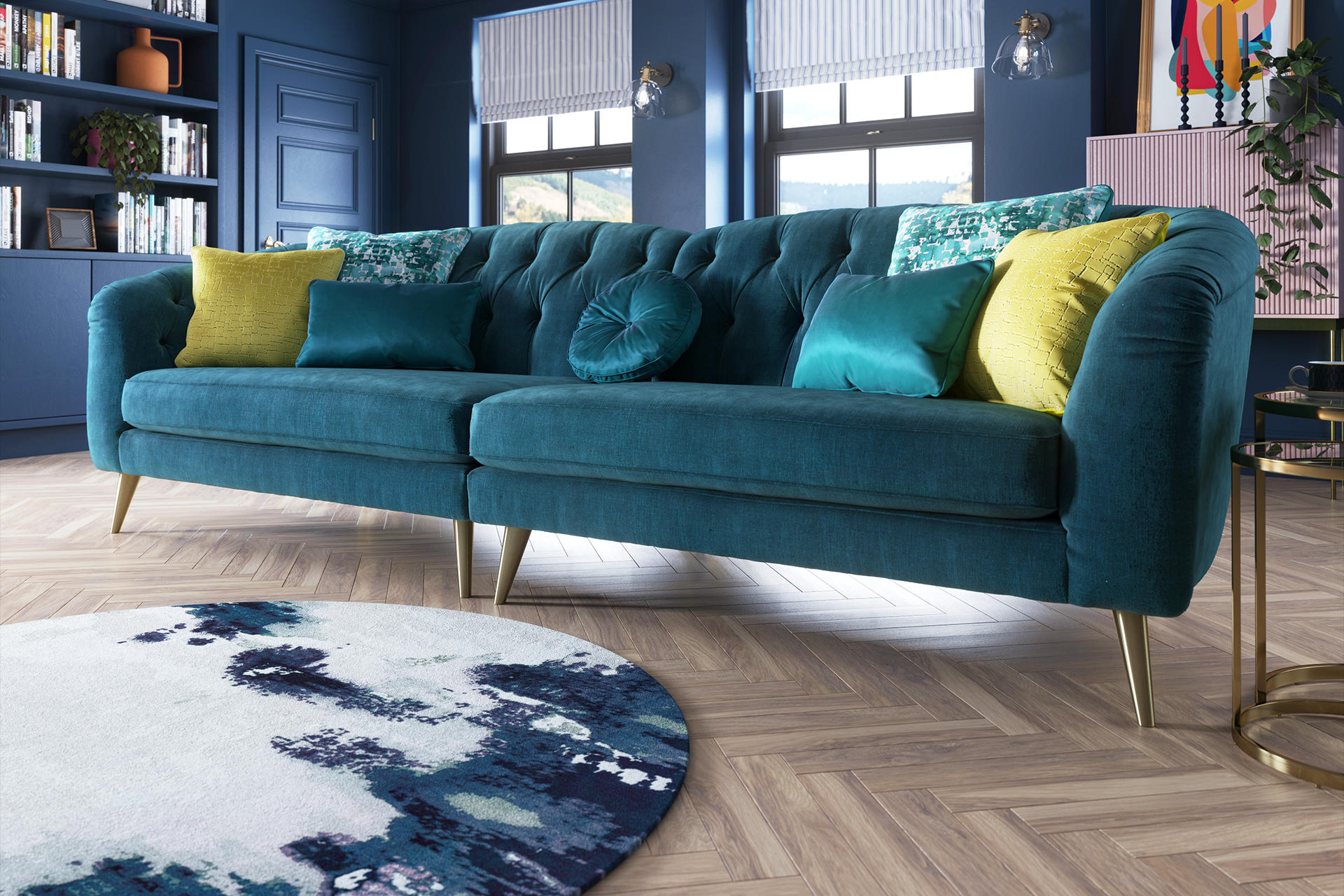 Grand in scale effortlessly stylish in design and built for luxurious comfort the Emperor gives you all the space you need to stretch out and relax like royalty. Handcrafted from beautiful sumptuous velvet that offers unbeatable softness and feels incredible to relax against.Unrivalled for its epic scale the Emperor has super deep seats that give you more room than ever to curl up with family and friends or stretch out on your own. Choose between full foam or a casual seat cushion interior that’s specially adapted for this range that features a super thick resilient foam core wrapped in pillow soft fibre for ultimate cosiness.Beautifully unique the Emperor features a distinctive rounded shape along the back of each seat creating the feeling of personal comfort for each seating section. The fibre filled backs and amazingly soft feather bolsters can easily be arranged to help you find the perfect spot to relax for an evening at home. Handmade from a mixture of patterned velvet and sophisticated silky fabric the feather filled scatter cushions complement the design of the sofa adding an extra layer of luxurious comfort.For added durability and enhanced comfort each seat cushion is supported by solid steel serpentine springs aligned with silent wire. Featuring fishmouth springs that run along the very front edge of the base the Emperor is structurally superior ensuring long lasting comfort and relaxation for you and your family.Intricate panelling detailing runs all the way along the sides and around the beautifully curved backs of the Emperor creating a deep quilted finish. Elegant contrast piping along the edges of the back cushions and solid wood block feet complete the look.Available in a choice of sofa sizes chair footstools and a range of corner configurations including modular options that make delivery easier. The Emperor is exclusively designed expertly handcrafted and guaranteed for 20 years.Sofology - Feel at home on a sofa you love.