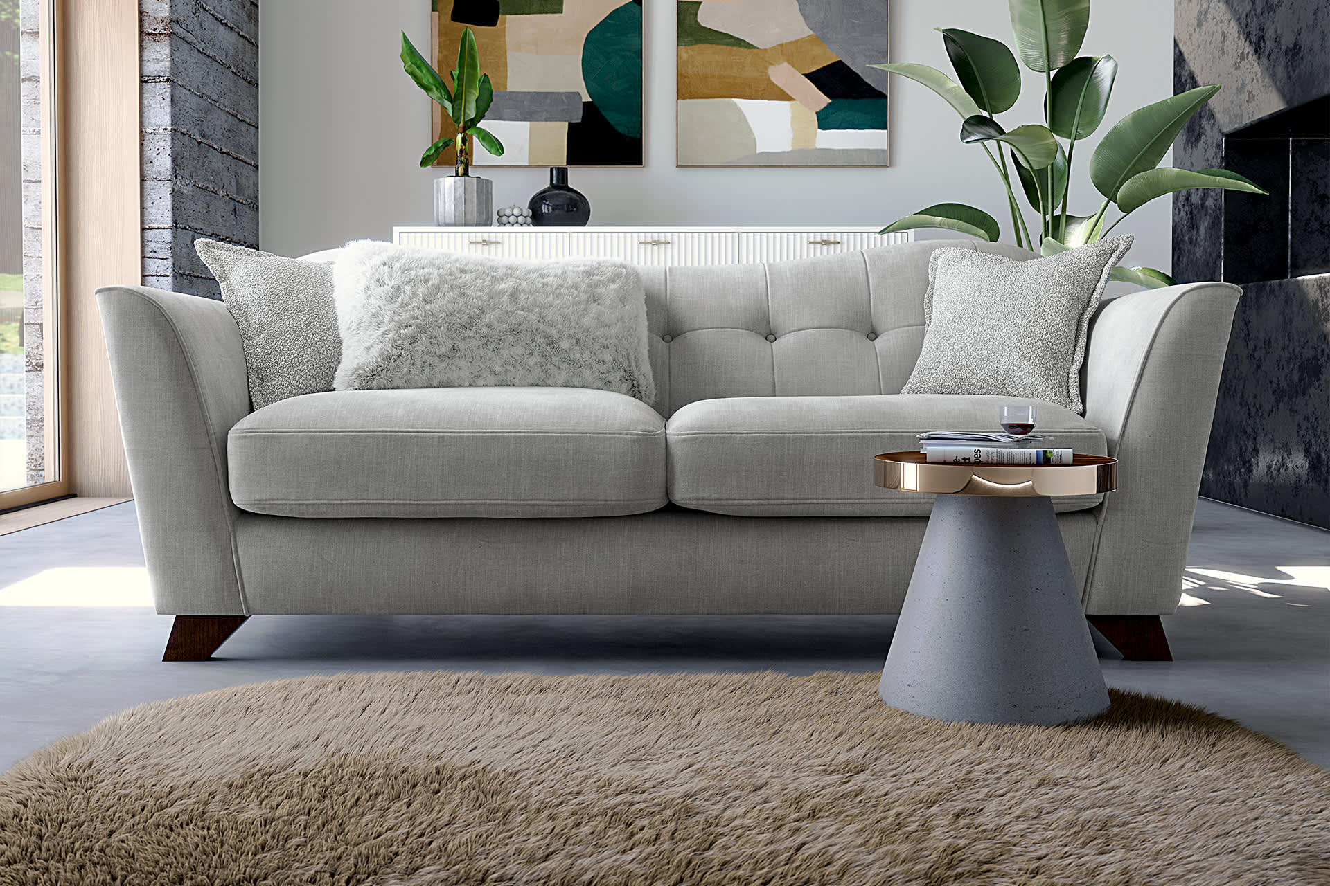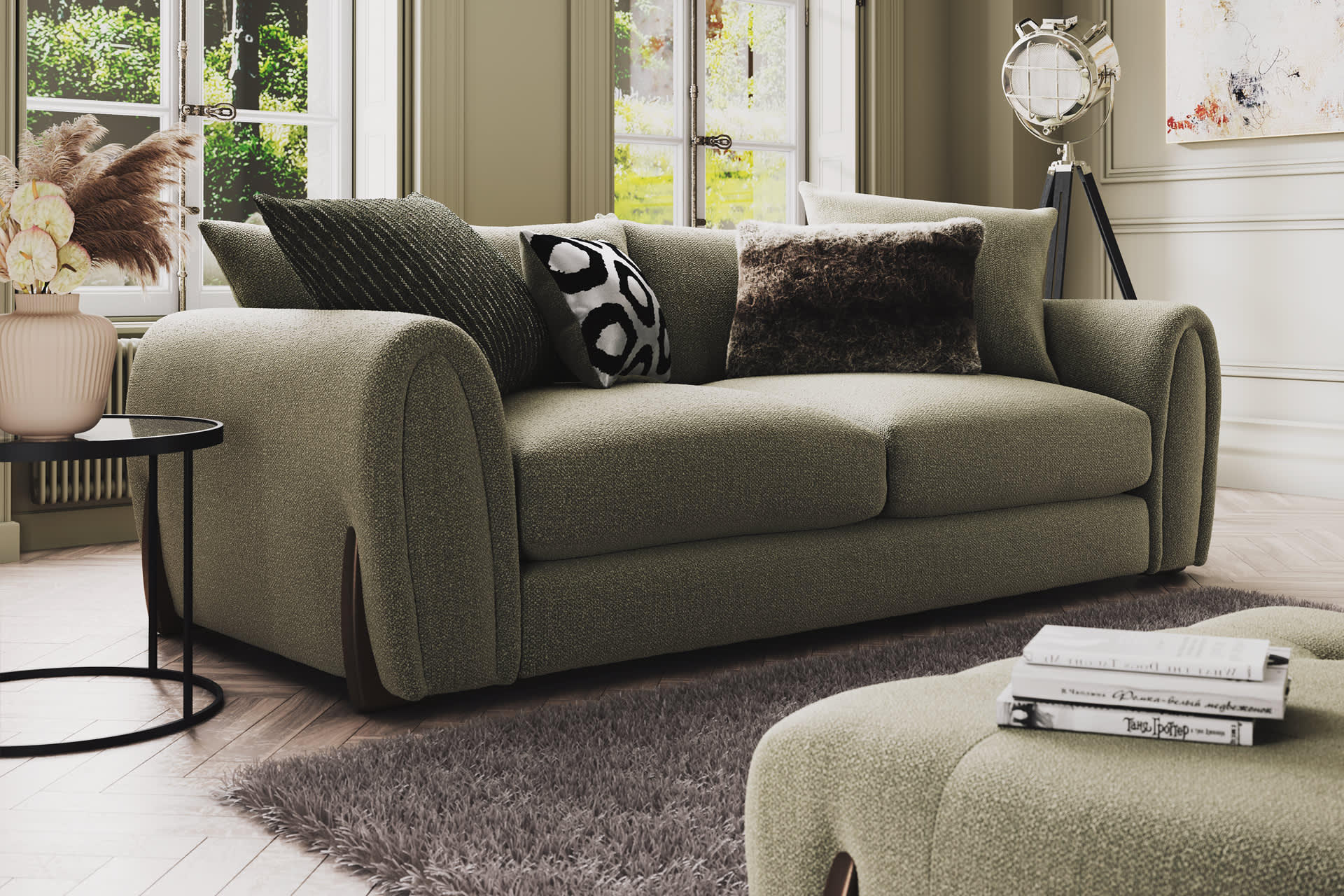 Give your space a curvaceous contemporary look with our Ambleside sofa. Designed to be super cosy this range is expertly handcrafted from a choice of soft durable woven mix or luxurious tactile velvet fabric in a choice of pretty shades to suit your interior decor.Crafted with a flowing sleek silhouette the Ambleside truly stands out for its unique curved arm shape which adds extra personality to the range. Super inviting these arms are narrow to offer more space for the whole family to relax. Finished with intricate button detailing on the back cushions this sofa features high set wooden feet available in a walnut or weathered oak shade sitting off the floor for a modern feel and also makes cleaning underneath easier.Seats filled with foam wrapped in soft Dacron fibre offer the perfect balance of comfort and support as you relax on the Ambleside. Serpentine springs aligned with silent wire distribute weight evenly across the sofa to make maintenance easier. Kick back and relax against soft fibre filled back cushions which hold you in place as you unwind. Feather-filled scatter cushions crafted from the body fabric of the sofa are included in the range and add extra style and comfort to the sofa.Create your own haven of relaxation with a choice of sofa sizes loveseat chair and footstools available in the range. The Ambleside is exclusively designed expertly handcrafted and guaranteed for 20 years.Sofology - Feel at home on a sofa you love.