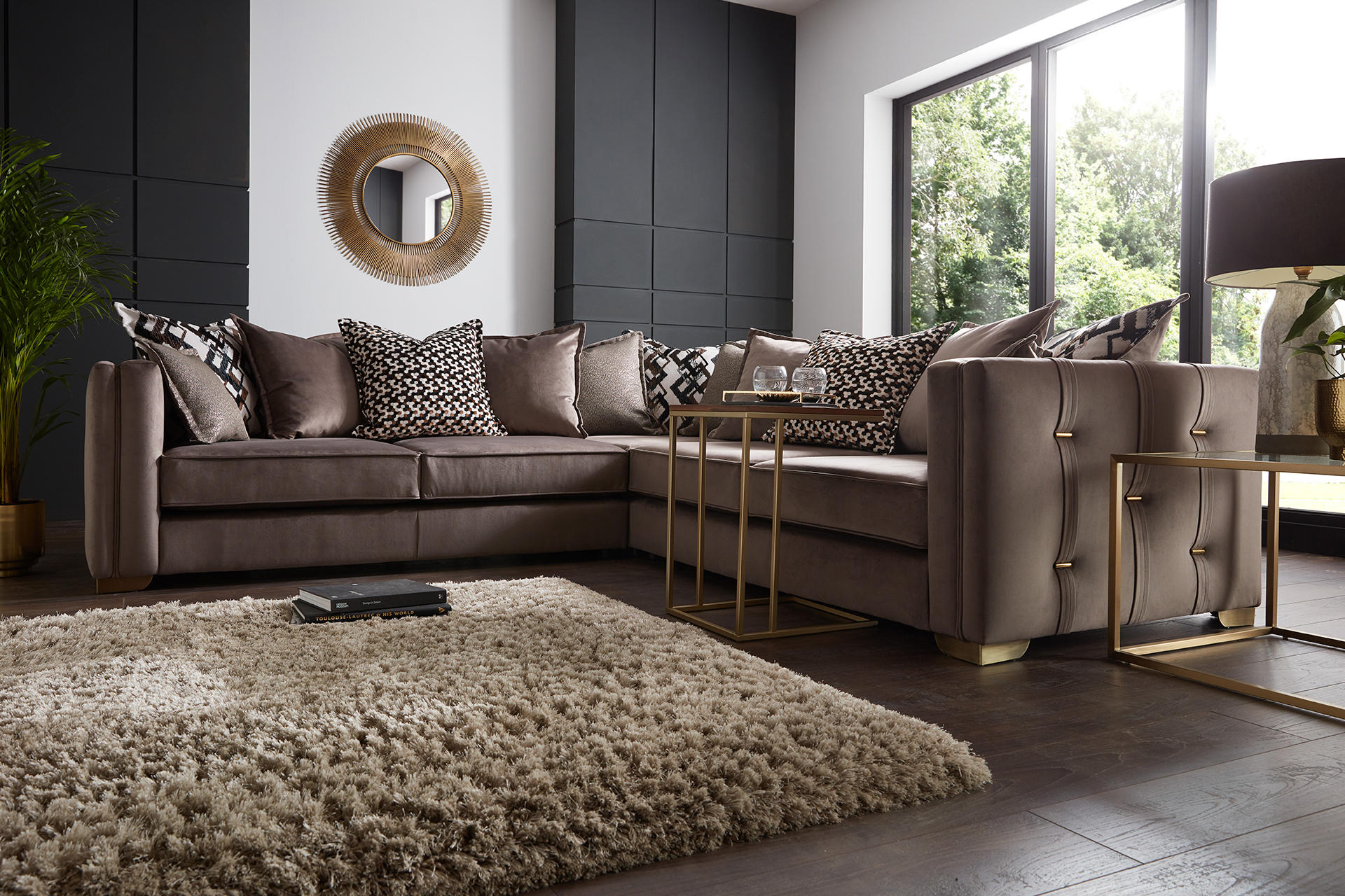 Enjoy larger-than-life comfort on our Titan sofa. Delivering optimum comfort this sofa will be perfect as a glamorous centrepiece in your space. Expertly handcrafted from soft luxurious velvet fabric the Titan is available in a selection of shades so you can fit it seamlessly into your decor scheme.Sitting low to the ground the Titan feels super cosy to relax on and features intricate design details that make this range stand out from the rest. From the bold arms with an inlaid design to the bar-shaped stud detailing the Titan will add extra indulgent beauty to your home. Finished with discrete metallic feet you can choose between a silver or gold shade to match the colour of the stud detailing.Enjoy the amazing comfort and support of seat cushions that are filled with foam wrapped in soft Dacron fibre - these seat and back cushions are reversible so you can flip and rotate them to keep them looking full and feeling comfortable. Opt for fibre filled back cushions for a more traditional look or enjoy the luxurious feather filled pillow back option if you want to customise your comfort. Serpentine springs aligned with silent wire support the seats ensuring you don’t sink into the corners of the sofa.Create a relaxing haven you’ll love to come home to with a choice of sofa sizes corner configurations chairs and footstools available. Choose the U-shaped corner option to make the most of your space and enjoy extra room to stretch out and relax. Customise the look and feel of your sofa with scatter cushions included on this range.The Titan is exclusively designed expertly handcrafted and guaranteed for 20 years.