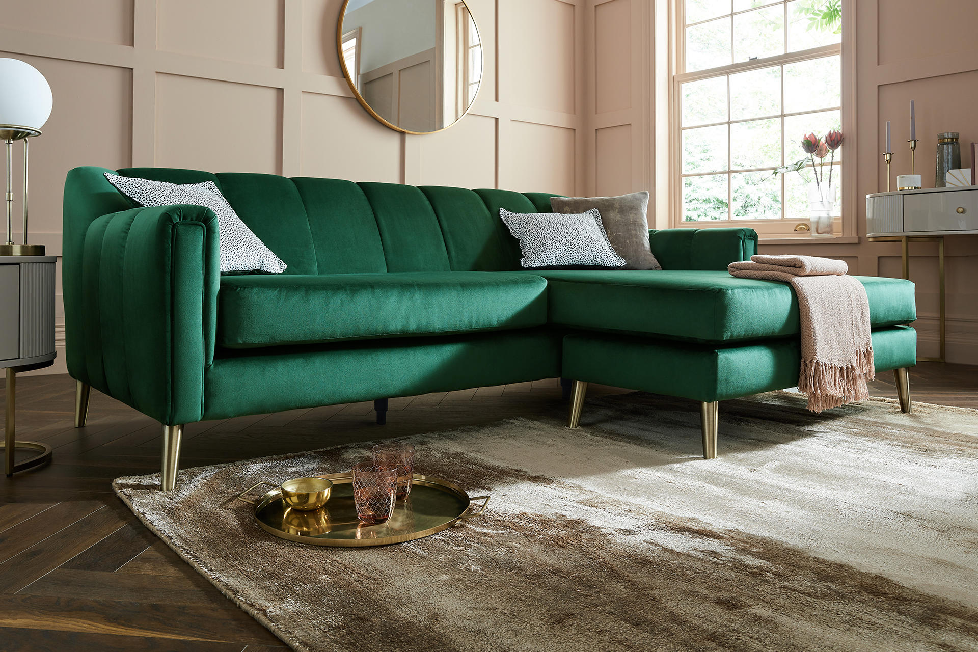 Combining cosy curves with bold straight lines, our beautiful Moxie sofa is designed to help your mind unwind. Lovingly handcrafted from luxurious ribbed velvet fabric, this range comes in an eye-catching selection of shades from deep teal to burnt orange. Feather filled scatter cushions are included in the range, available in matching fabric or in a unique chevron pattern that adds contrast to the sofa, offering style and comfort in equal measure. With a curvaceous arm design and softly rounded seats, the Moxie combines contemporary style with classic, cosy comfort, and is finished with intricate piping detail along the arms, seats and back cushions. High set metallic feet in a choice of gold, silver and black shades complete the look, raising the sofa off the floor for a modern look. Sit, lie or curl up on seats filled with foam wrapped in soft Dacron fibre, offering the perfect balance of comfort and support as you get cosy with the people you love. Fibre filled back cushions envelop you in cloud-like comfort as you lean back, offering comfort you won’t want to leave. Serpentine springs, aligned with silent wire, sit under the seat cushions and distribute weight evenly across the sofa to keep it looking great. Find a shape and size to suit your space, with a choice of sofa sizes, corner configurations, chaise, chair and footstools available. The Moxie is exclusively designed, expertly handcrafted and comes with a 20 year structural guarantee included. Sofology - Feel at home on a sofa you love.