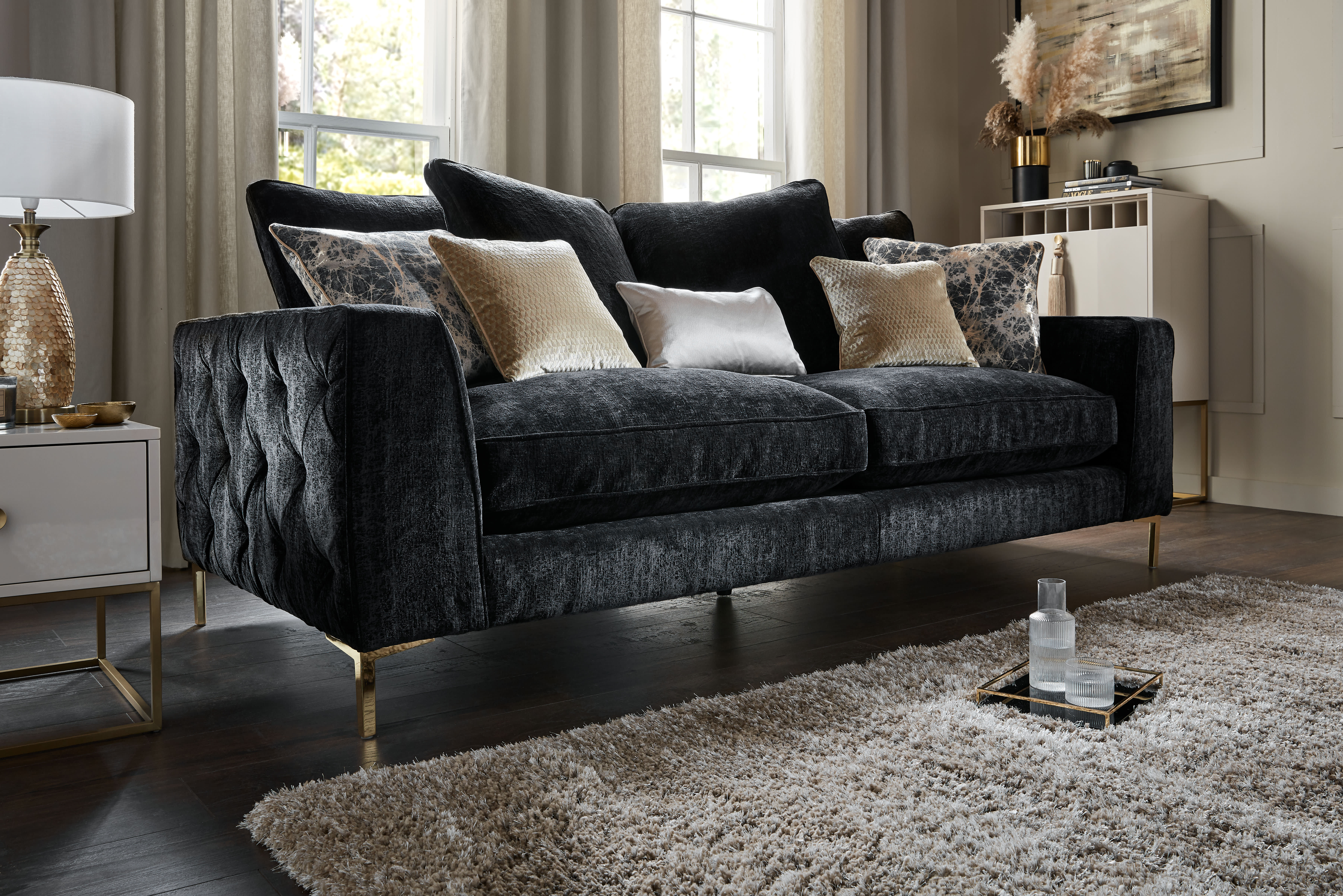 Sleek contemporary and luxurious our Rococo sofa makes relaxation look good. Expertly handcrafted from soft tactile chenille fabric this range is available in a choice of eye-catching shades from deep black to silver and grey. Complementary scatter cushions are included in the range feather filled for amazing comfort and crafted in block colour and patterned fabric.Designed to offer stunning on-trend style the Rococo features beautiful button-finished diamond tufted stitching along the sides of the sofa for an opulent look with an open silhouette that makes this sofa look super inviting. Finished with high set metallic feet in a choice of gold or chrome finish you’ll fall in love with the Rococo every time you take your seat.Available with a choice of seat fillings and back cushion options the Rococo allows you to customise your comfort. Choose seats filled with foam wrapped in Dacron fibre for a supportive feel or opt for seats featuring a foam core wrapped in a thick layer of soft fibre for a more luxurious sit. Opt for fibre filled full back cushions for a more traditional look and feel or choose a more contemporary style with pillow back cushions featuring luxurious feather fillings. Serpentine springs aligned with silent wire support the seat cushions and ensure you don’t sink into the corners of your seat.Create your own cosy haven at home with a choice of sofa sizes corner configurations chairs and footstools available in the range. The Rococo is exclusively designed expertly handcrafted and guaranteed for 20 years.Sofology - Feel at home on a sofa you love.