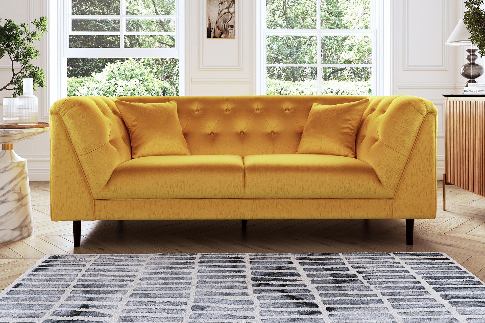 Enjoy contemporary style and sublime comfort on the Bridgerton sofa. Designed to offer elegance and luxury this range is available in a choice of two fabric options: a textured slub velvet or a velvet-like chenille with both available in a range of shades from nugget gold to slate grey.With a bold silhouette the Bridgerton is a modern take on the classic chesterfield design. The high angled arms give the sofa an inviting cosseting feel with intricate button detailing across the back and the arms for an elegant look. Finished with piping detail and luxurious bandage stitching on the arms the Bridgerton sits on sleek high-set feet available in a choice of walnut or weathered oak shades.Enjoy an amazing balance of comfort and support on seats backs and arms filled with foam wrapped in soft Dacron fibre. The seats are supported by solid steel serpentine springs aligned with silent wire helping with the maintenance of the sofa by distributing weight evenly across the cushions. To complete the cosy feel the Bridgerton is accented with feather-filled scatter cushions in complementary shades to match your sofa fabric.Style your space with a choice of sofa sizes chaise chairs and footstools available in the range. The Bridgerton is exclusively designed expertly handcrafted and comes with a 20 year structural guarantee included.Sofology - Feel at home on a sofa you love.